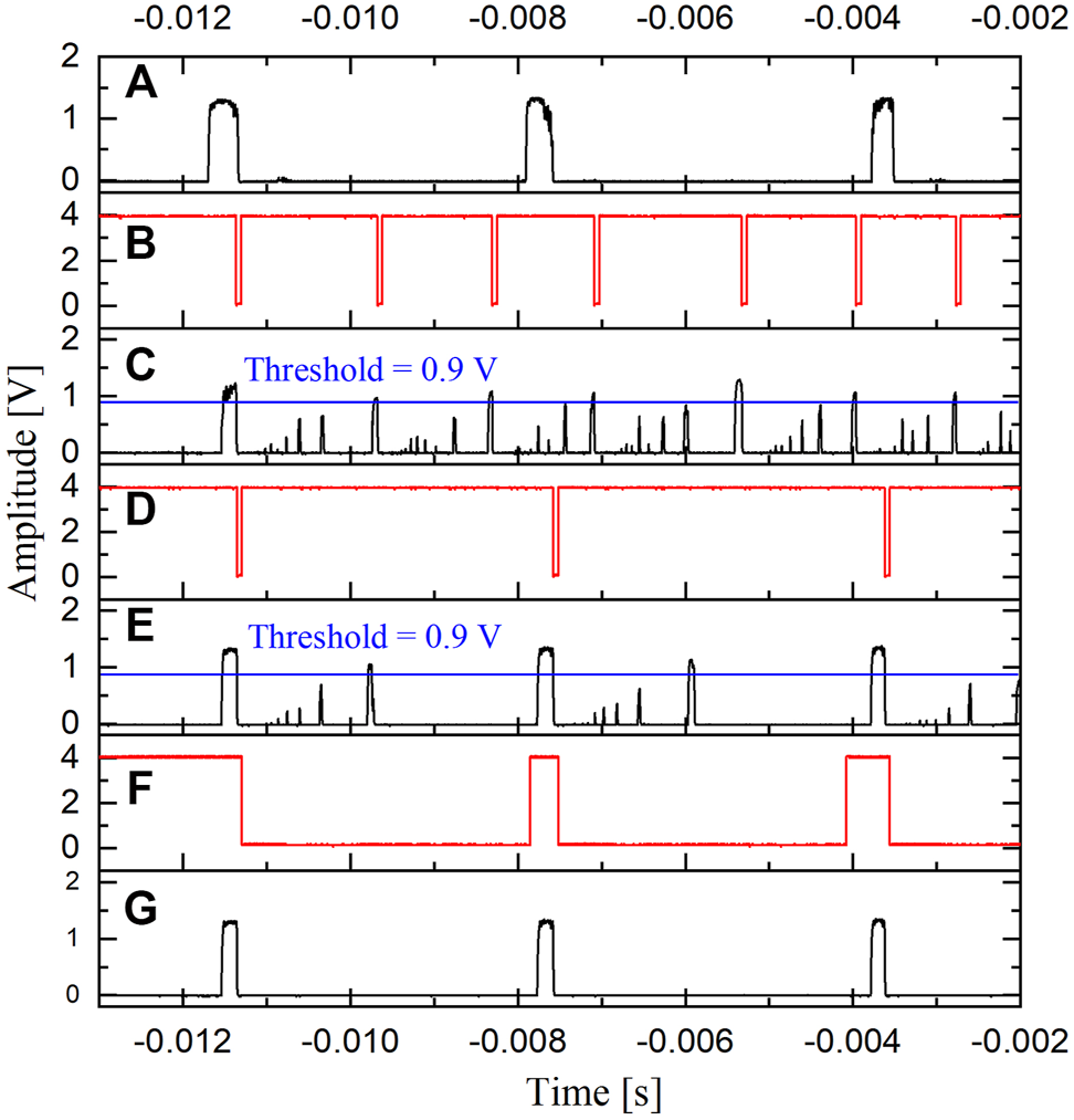 The time sequence of the process signals. (A) The cavity transmission modes without the trigger of ringdown event; (B) the pulse signal to the ES1; (C) the cavity transmission modes of OF-LCRDS, and a series of messy cavity modes are observed under this situation; (D) the pulse signal to the ES1 with the ES2; (E) the cavity transmission modes of OF-LCRDS with the ES2; (F) the pulse signal to the ES2 to filter out the unexpected modes; and (G) the signal to the DAQ card with the ES2.