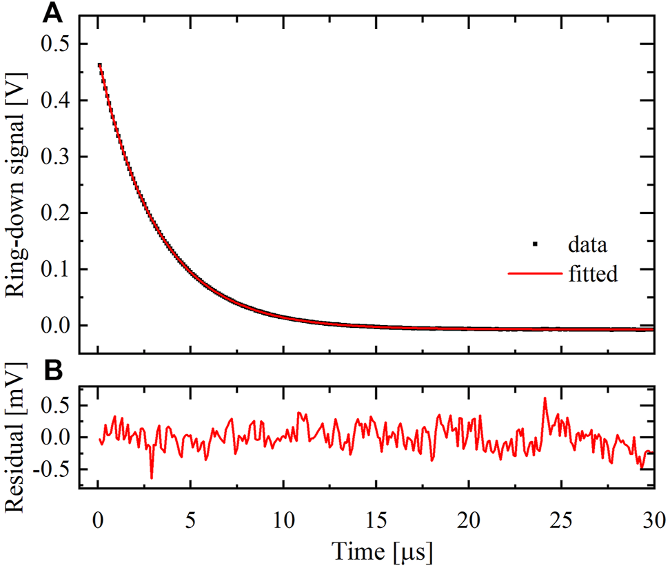 (A) Measured single ringdown event (black dot) and its fitting result by an exponential function (red line). (B) The fitting residual.