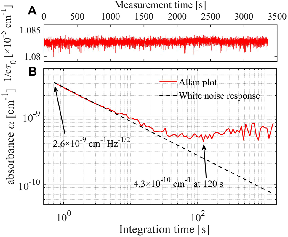 Long-term ringdown time measurement of a single cavity longitudinal mode. (A) Empty cavity decay rate; (B) Allan variance plot.