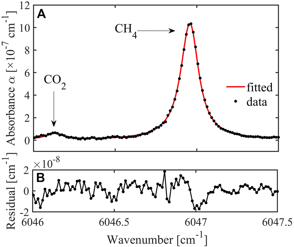 (A) Measured CH4 absorption spectrum and its fitting result with Lorentz function; (B) fitting residual.