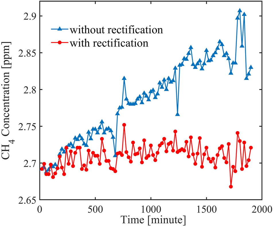 The variation of the empty cavity ringdown time, owing to temperature fluctuation and mechanical vibration, is the dominant limitation to the long-term stability of CRDS. To solve this problem, the empty cavity ringdown time is rectified regularly by the ringdown time at the laser frequency far away from the gas absorption transition. To verify the effectiveness of this method, a long-term concentration measurement with a time interval of 20 min and a duration of 34 h for CH4 gas with a constant concentration has been performed. The dotted lines in blue and red in Figure 6 are the measured concentrations without and with rectification, respectively. Without rectification, the drift range of retrieved concentration is 0.2 ppm within this measurement time. After the rectification, the drift range is suppressed to 0.08 ppm, which shows an improvement with a factor of 2.5.