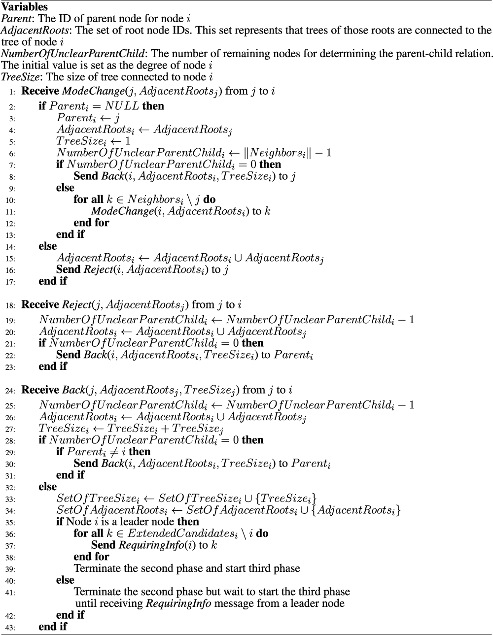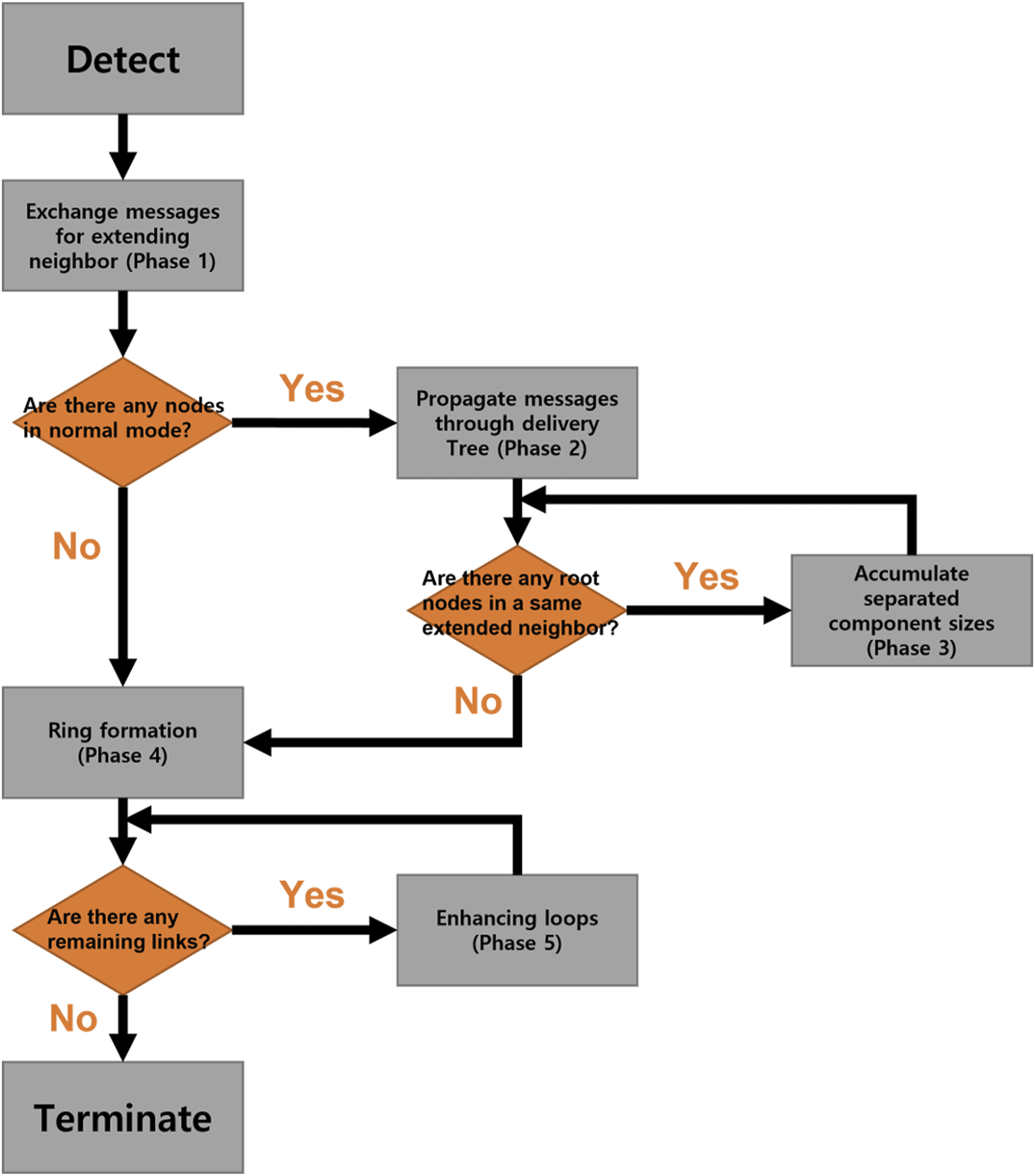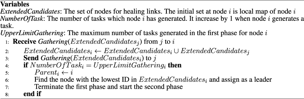 On the asynchronous processing, our distributed algorithm consists of five phases. Figure 8 shows the flow chart of five phases in healing process. The proceeding phase at a node is distinguished by variables and messages used in each phase. We assumed that all variables and their initial values are already set in the normal mode.