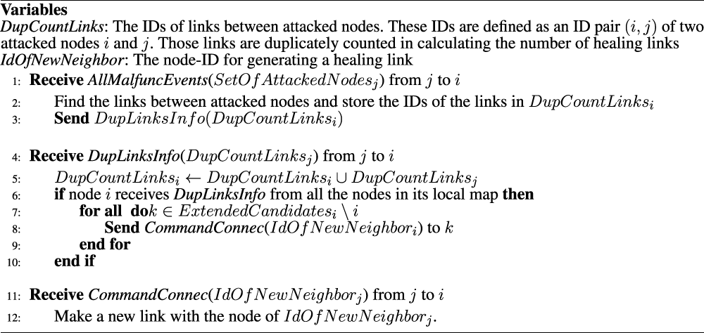 Nearest neighbors of attacked nodes detect the damages as disconnections and try to connect each other by healing links because those nodes lose some paths to other nodes by attacks. After the detection, damaged nodes stop the normal mode for transferring supplies or packets and start the healing mode. In the healing mode, damaged nodes send control signals to other nodes within three hops from each of them, although equipment such as wireless devices for control signals are different from normal tools used in optical fiber communication or transportations by flights. Initially, as default, it is assumed that each node has a data set called local map to store identifiers (IDs) of nodes within three hops from itself. Before healing, a set of candidate nodes for healing links is equal to its local map. These candidates are extended from the initial set to maintain larger connectivity by healing.