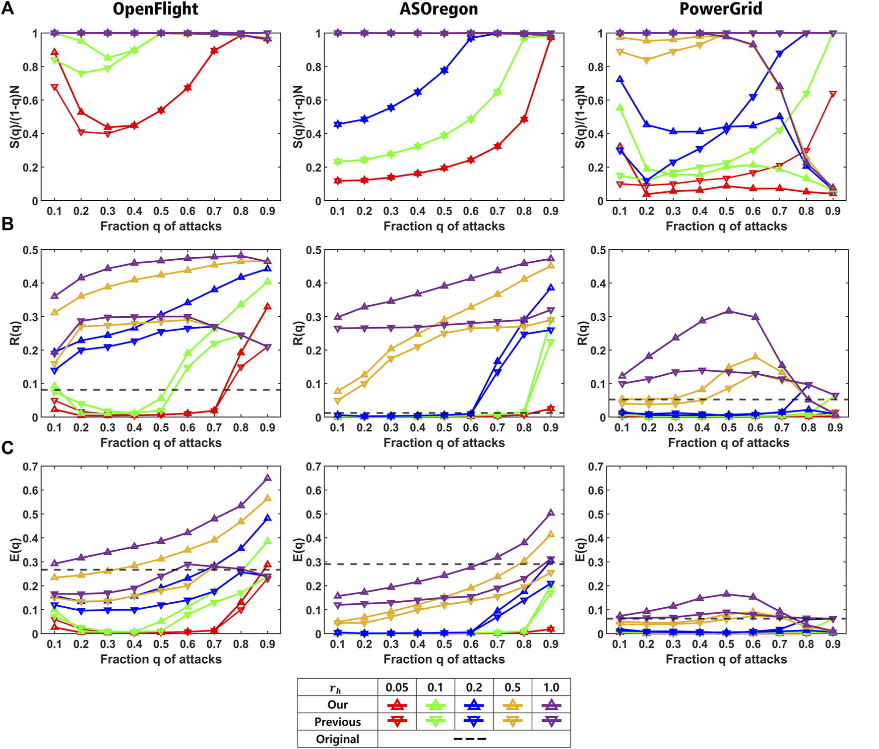 Comparison of our method (marked by upper triangle) and the previous method (marked by lower triangle) for OpenFlight, AS Oregon, and PowerGrid. (A) Ratio S(q)/(1−q) N, (B) robustness R(q), and (C) efficiency E(q) in healed networks for each rh in the definition of Mh. Red, green, blue, yellow, and purple lines show the results for rh = 0.05, 0.1, 0.2, 0.5, and 1.0, respectiely. The black dashed line represents the corresponding values in the original network.