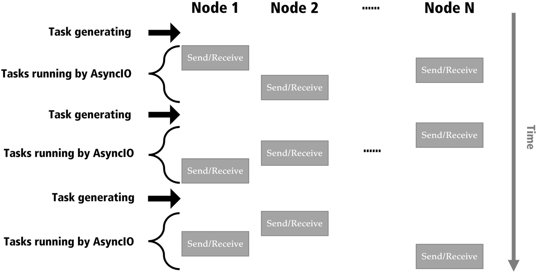 In order to emulate our distributed algorithm on a PC, we applied the AsyncIO module in Python 12. A task at a node consisted of sending and receiving messages between its extended candidates. Each of nodes generates a task concurrently by using AsyncIO. Although the AsyncIO module can emulate the concurrent execution of tasks generated at almost same time, the detail is internally ordered. To implement it with a corresponding short time delay encountered by a physical factor, we randomized the execution order of tasks in the total N nodes. Note that some nodes without generating tasks are excluded from the order. Figure 7 shows the schematic diagram of such task processing. Horizontal and vertical directions indicate N nodes in healing mode and global timeline of our healing process, respectively.