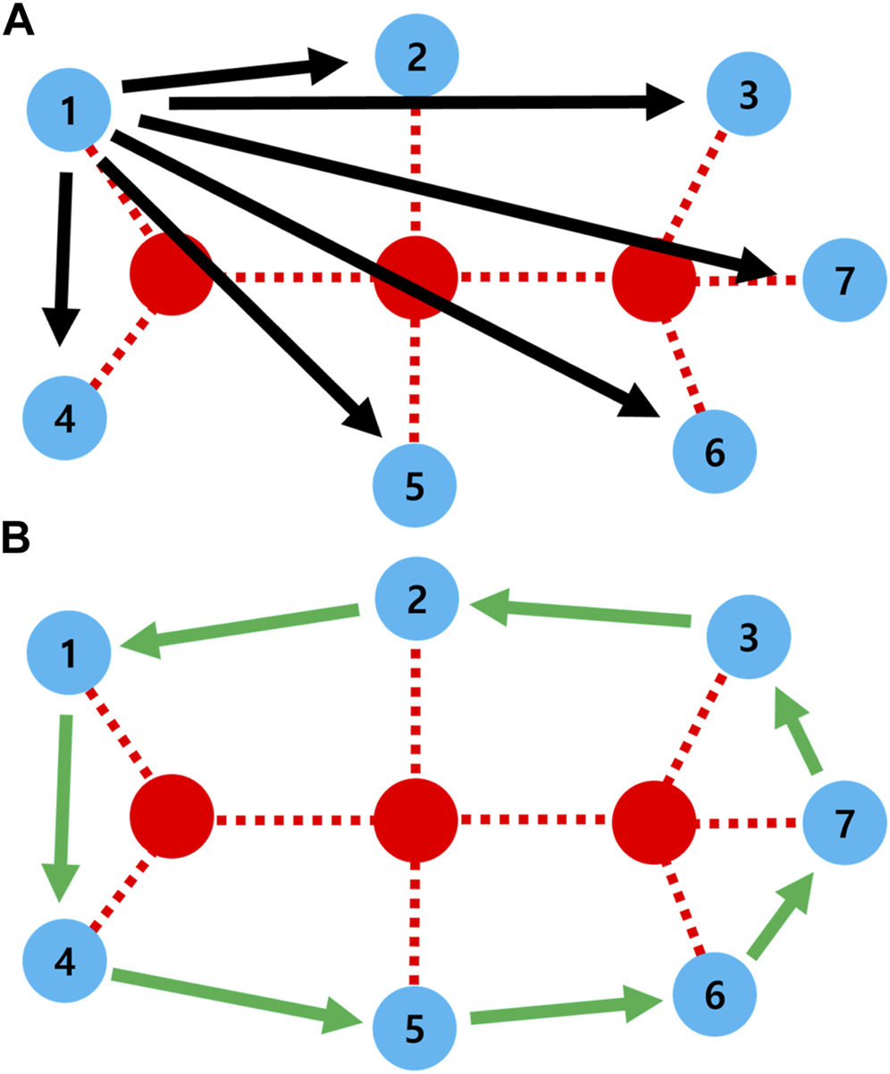 After extending the candidates, a ring between damaged nodes is formed by generating healing links (green lines in Figure 2). In the ring formation, every node on the ring has the same extended candidates which are on different sets of nodes on other rings. At several locations, rings can be formed in a healed network. Instead of a random order for connections as a ring in the previous method [20], we chose the candidates by decreasing order of their connected component sizes in order to maintain larger connectivity. As a tie-breaker, if more than two nodes belong to connected components with the same size, one node is randomly chosen in the order of connections for the ring.