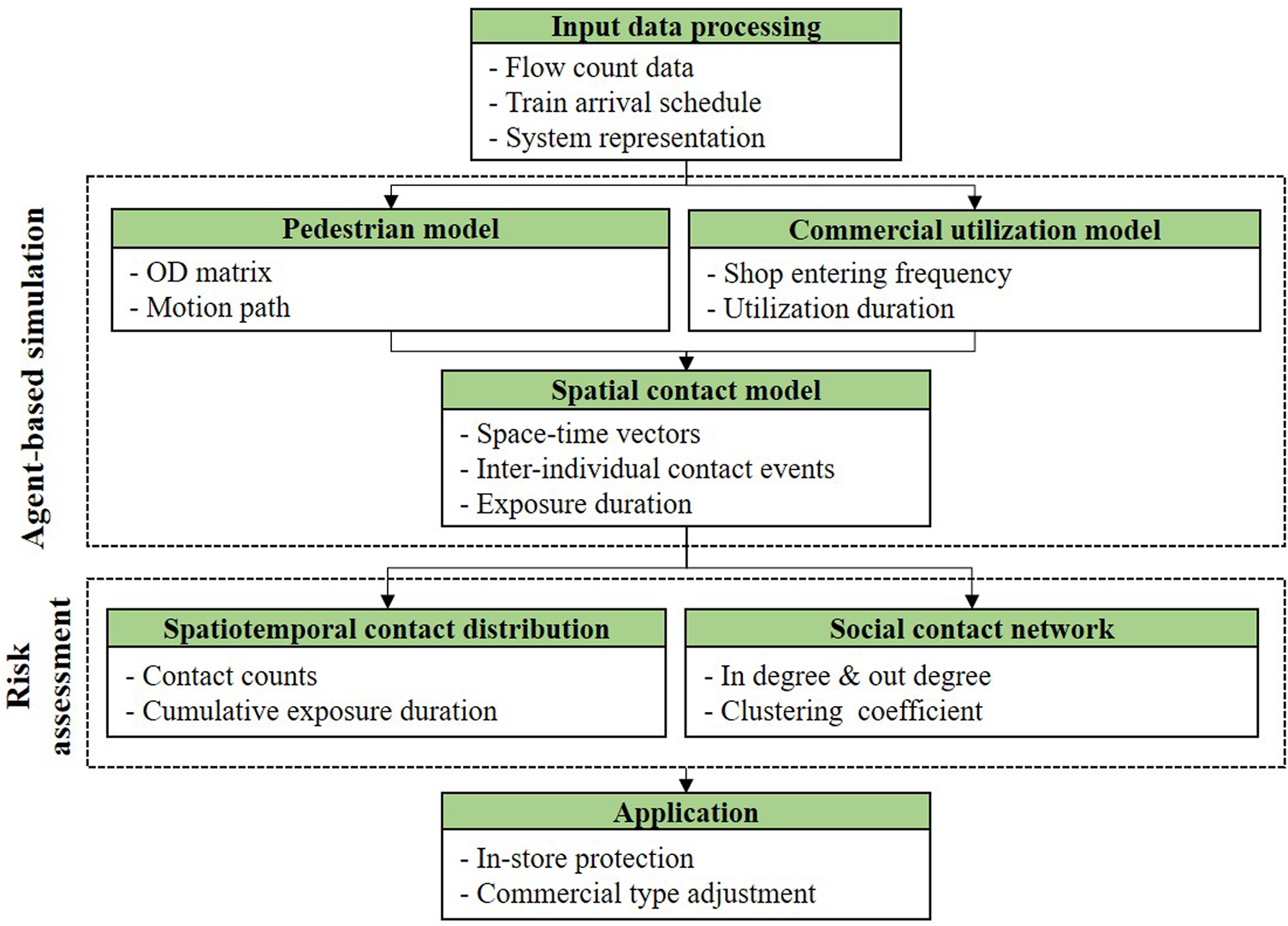 A subway station is connected to the underground commercial street on west side which periodically generates passengers from the arrival train. For an entrance, the impact of aggregate pedestrian crowds on the inter-individual contact were considered by setting the agent generation velocity according to the video observation data. After the agent is generated, the agent moves between nodes according to its pre-assigned path and walking speed. For the non-entrance nodes, the arrival time of the agents are not set to match the real observation data.