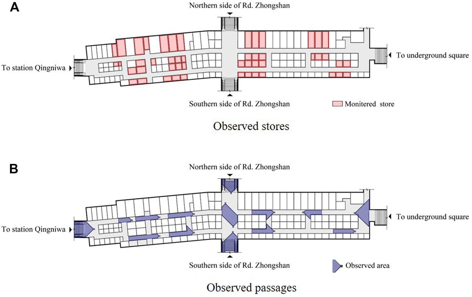 Study area and data collection area: (A) observed stores; (B) observed passages.