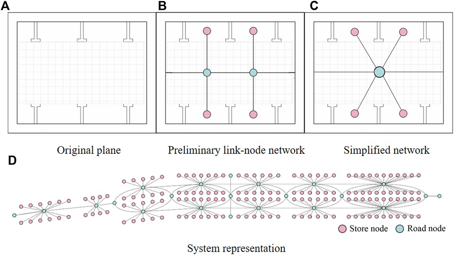 System representation of study area: (A) original plane; (B) preliminary link-node network; (C) simplified network; (D) system representation.