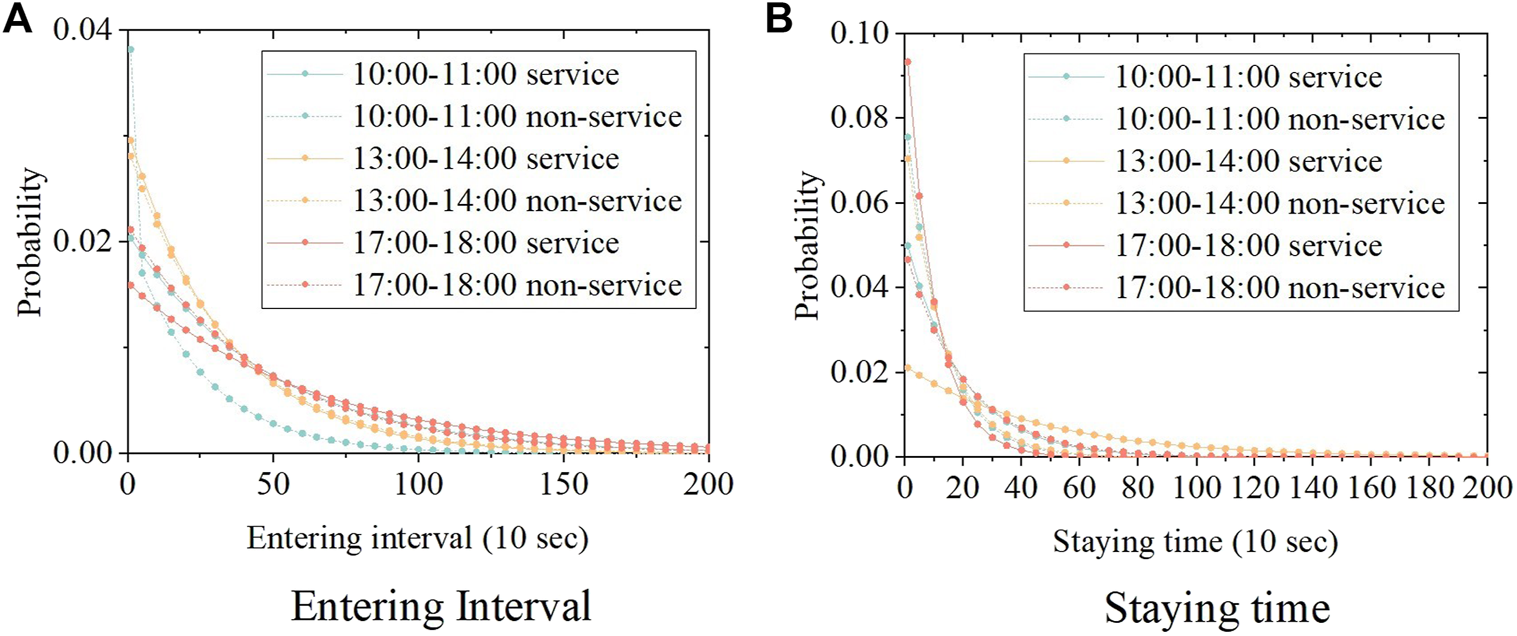 The usage time of non-service stores is not affected by the number of staff and the waiting time in a queue. Therefore, each customer’s usage time is an independent variable. For service shops, it is necessary to take the waiting behaviors into account. To exclude the additional waiting time, the data collection only took the utilization behaviors without waiting into account. Based on observation data, the duration of agents staying in a specific store is modeled by the probability distribution. Similar to the store entry probability model, the time-specific parameters of service stores and non-service stores was calibrated respectively based on the observed data.