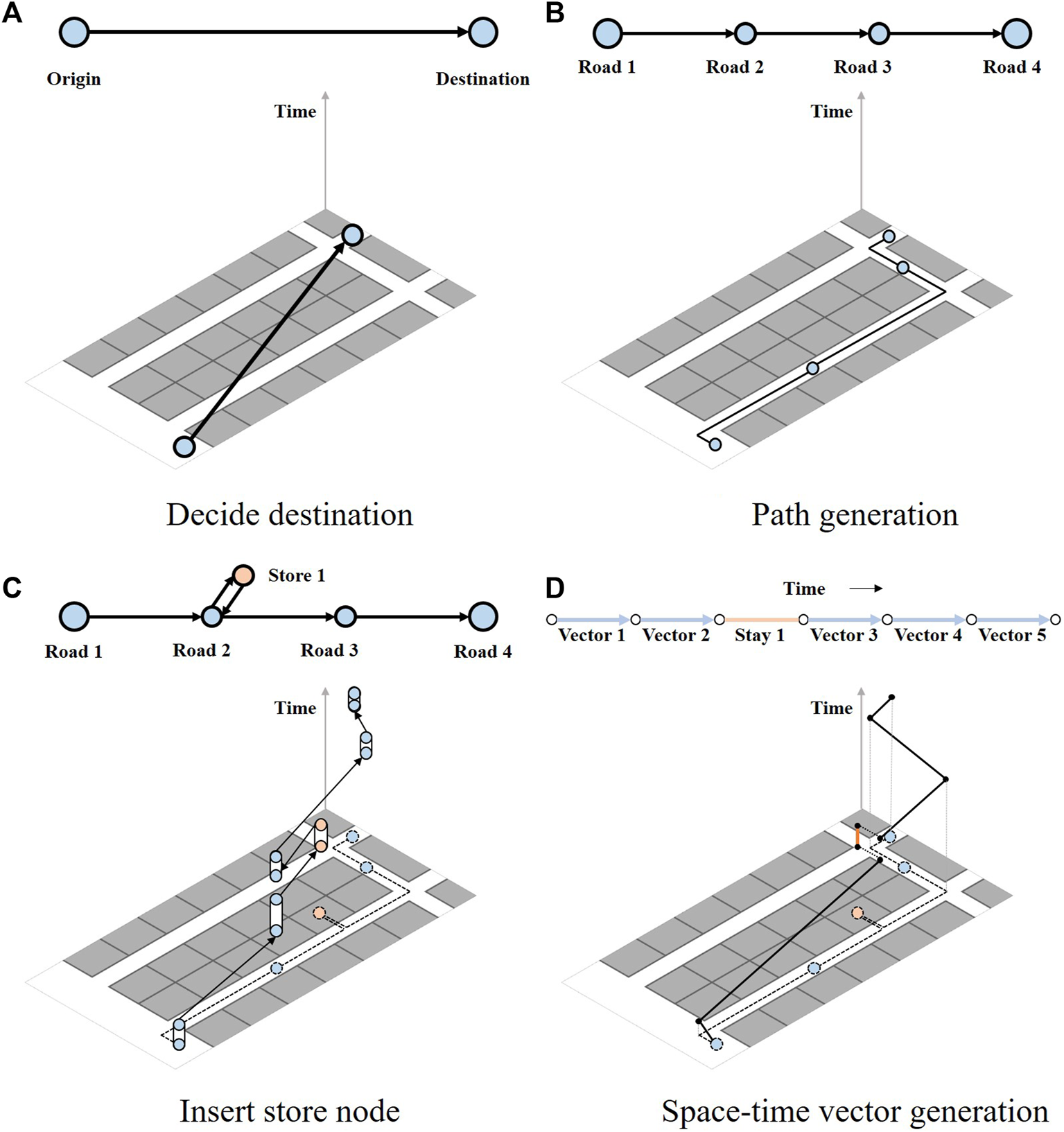 For an agent generated at the origin node, its destination node is set based on OD matrix (Figure 5 (a)). This study uses the Dijkstra algorithm to obtain the shortest path between each OD pair. A sequence of road nodes in the simplified network is generated based on agent’s spatial path (Figure 5 (b)). For agents with store entry records, store nodes are inserted into the node sequence. As shown in Figure 5 (c), the start and end time of the states responding to the road nodes in the generated sequence are assigned according to agents’ walking speed and the length of passages. Stay duration within the store nodes were set through store utilization model. With the agents’ space-time vectors within the node sequences, their space-time paths within in the actual pedestrian network are generated accordingly (Figure 5 (d)).