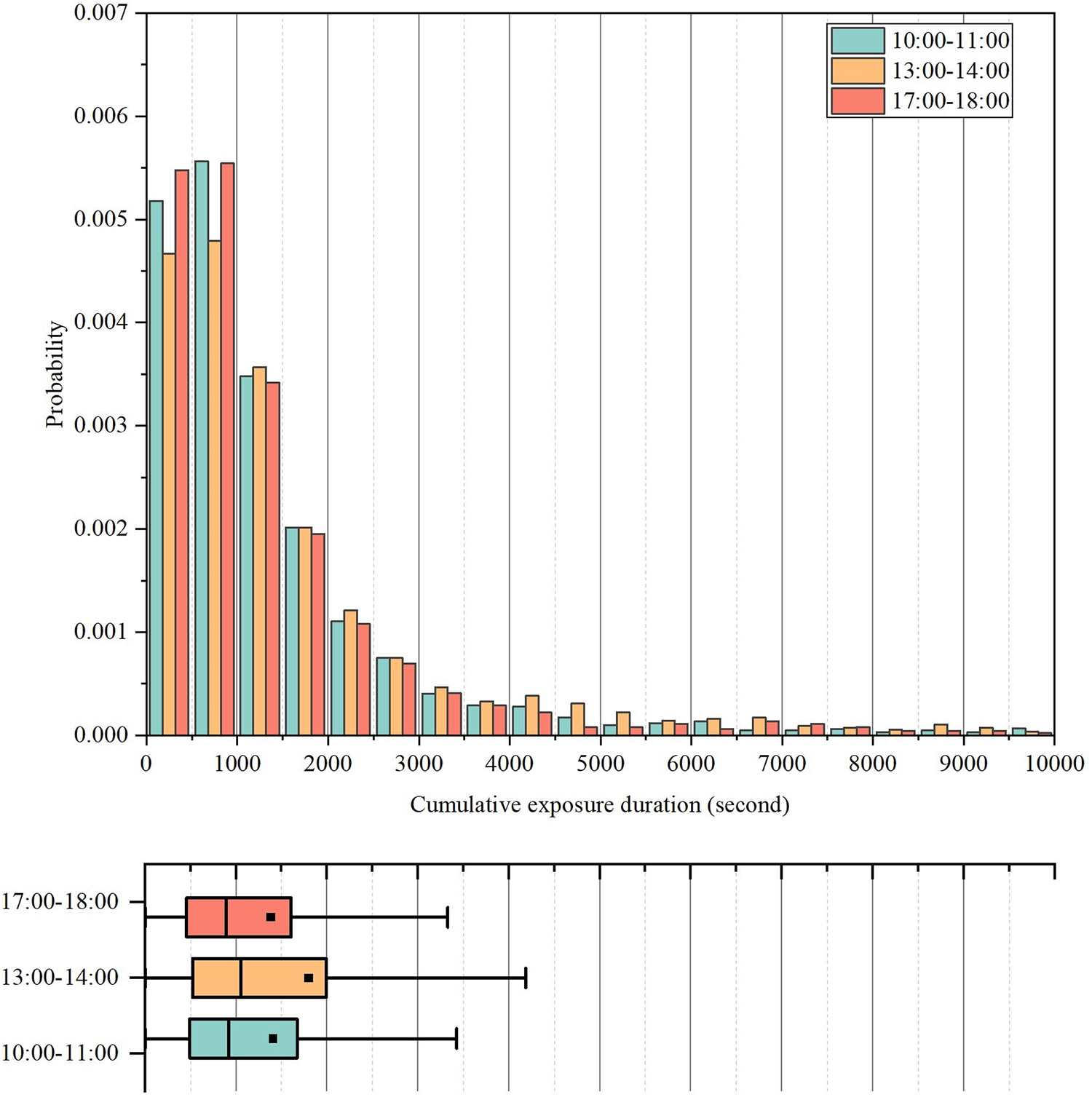 The performance of a simulation with an exponential distribution is not an efficient method, because variables obtained with an exponential distribution are continuous, while the simulation is discrete. In our study, we turned continuous variables into discrete ones by treating the number of events as a random variable. As the interval time corresponds to an exponential distribution, the process of pedestrian entry can be considered as a Poisson process [21]. For a Poisson process, the probability of an event occurring k times in the period of 10 s can be calculated by:where λ is the unknown parameter calibrated through exponential regression. Probability distribution based on regression results are shown in Figure 4 (a). It is found that shops receives more customers during the lunch hour (13:00–14:00). Customer frequencies of service and non-service shop are significant different in the morning hour (10:00–11:00).