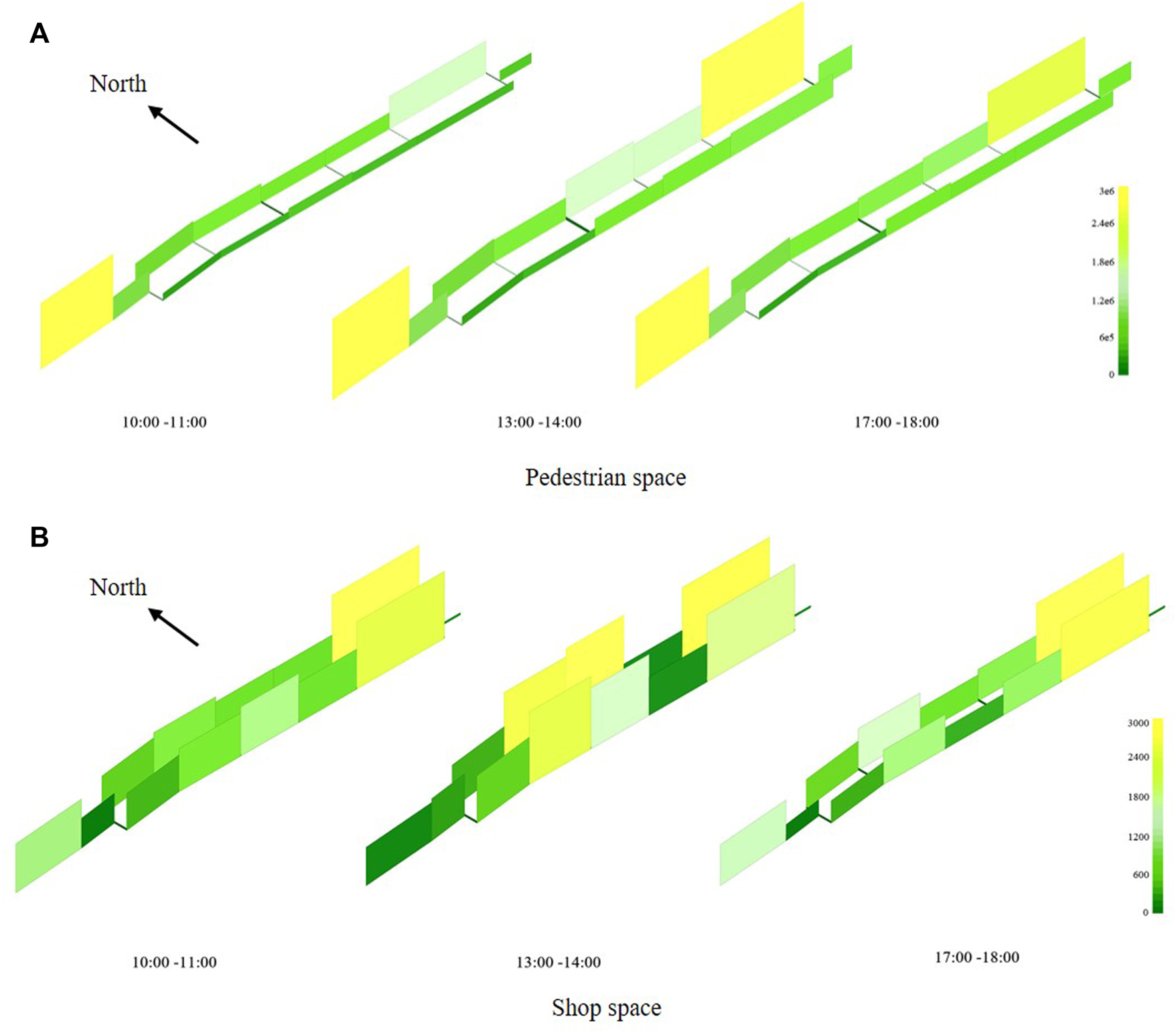 For managers of underground commercial streets, they are more concerned about the spatial distribution of the regions with frequent contact. In this part, according to the different locations of close contact, close contacts are also divided into contacts in pedestrian space and shop space. The risk of inter-individual contact in the pedestrian space is indicated by the accumulative exposure duration of all agents passed through a specific passage. For the contact degree in a shop was described the accumulative exposure duration of arriving customers. The mean value the contact degrees of all shops located on the same link is adopted as the indicator of the contact risk in the shop space. With the time-specific spatial distribution of cumulative contacts in the pedestrian and shop space, we can obtain the spatiotemporal distribution of inter-individual contact in study area. Links in the pedestrian network are used the spatial unit for visualization in this study.