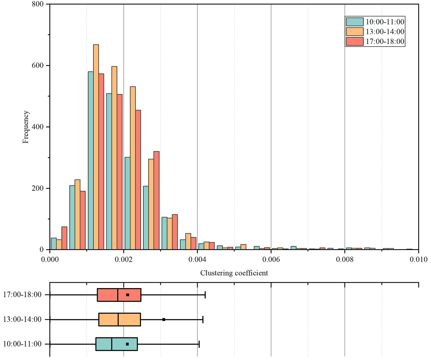 The clustering coefficient indicates the degree to which these agents cluster together spatiotemporally. It refers to the probability that any two neighbors of a node are adjacent to each other. The larger clustering coefficients indicate there are the more triangular structures are in the graph. According to the previous studies [