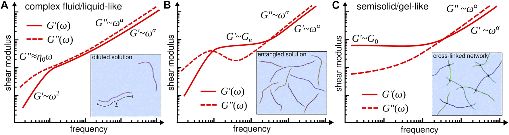 Typical viscoelastic responses characterised by the shear moduli G′(ω) and G′′(ω) for (A) complex fluid/liquid-like, (B) entangled, and (C) semisolid/gel-like solutions of semiflexible filaments. Inset drawings illustrate the configurations of the semiflexible filaments and their interactions in solution. Besides the identification of the distinct viscoelastic behaviours, the frequency-dependent shear moduli are often determined by experimentalists to provide a lower bound for the stiffness of the polymer biomaterials at different time scales [12].