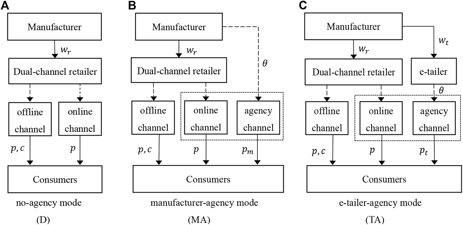 Channel structure of different mode: (A) no-agency mode; (B) manufacturer-agency mode; (C) e-tailer-agency mode.