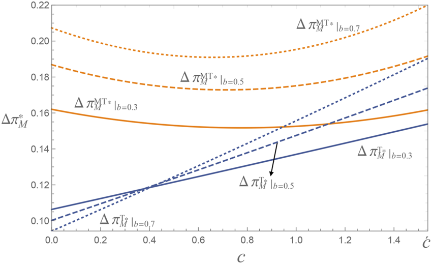 Lemma 1Compared to the D mode, under the MA or TA modes, (i) the retailer sets a lower retail price and (ii) the manufacturer sets a lower wholesale price. Mathematically, (i) , (ii) .Lemma 1 provides a comparison between the optimal prices of the retailer and manufacturer. When the retailer introduces a third-party seller with an agency channel, channel competition with a third-party seller causes the retailer to lose monopolistic advantages. Hence, the retailer has the motive of attracting consumers by lowering retail prices. To ease channel competition, the manufacturer dampens price competition by lowering the wholesale price.