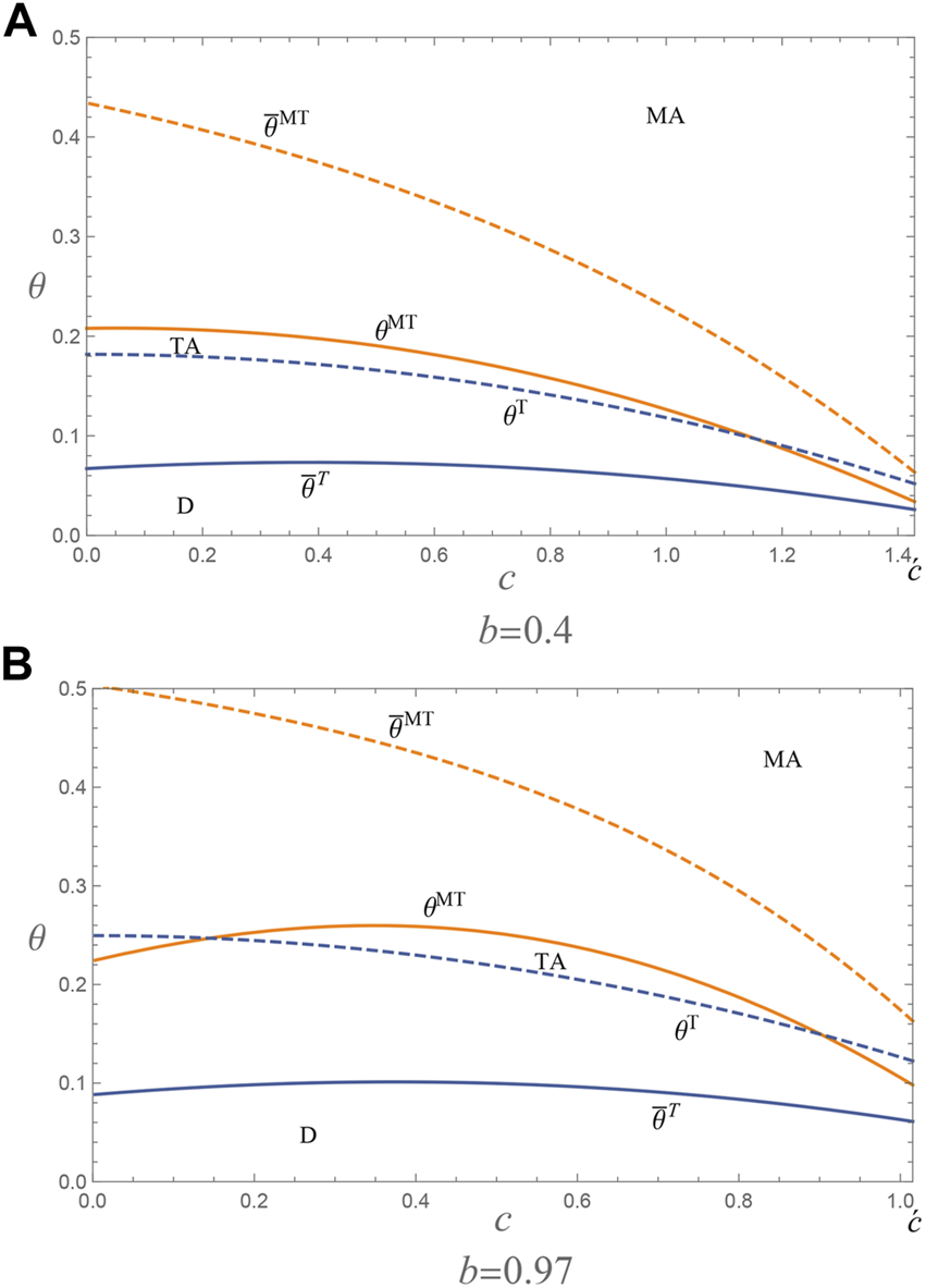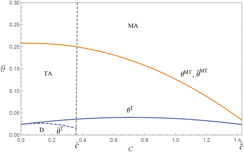 We consider a decentralized supply chain consisting of a manufacturer, a dual-channel retailer (called retailer), and an authorized e-tailer (called e-tailer). The manufacturer sells products to the retailer, who then resells them in a physical store and an online store. The retailer considers providing the manufacturer or the e-tailer with an agency channel that can directly access consumers in an online store. The retailer also charges a commission fee to the manufacturer or the e-tailer. We define the retailer’s online store as a hybrid store that adopts a reselling format and agency selling format. We also assume that the commission rate is exogenous and fixed within 50% [21, 28]. The following three channel structures are explored: No-agency mode (i.e., D), manufacturer-agency mode (i.e., MA), and e-tailer-agency mode (i.e., TA). These results are depicted in Figure 1.