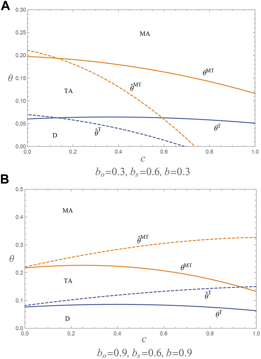 Lemma 2Compared to the D mode, under the MA or TA modes, when the offline operating cost is low, the retailer achieves higher demand; otherwise, the retailer achieves lower demand. Mathematically, (i) when , then ; otherwise , and (ii) when , then ; otherwise, .The expansion of agency channels involves two mechanisms for demand. The first is channel synergy, which shows that new consumers attracted by agency channels will not only buy in agency channels, but also turn to retailers’ channels, leading to an increase in the retailer’s demand. The second is channel competition, which is manifested in the fact that consumers who originally shopped in retailers’ channels will now move to agency channels to purchase, leading to a decrease in the retailers’ demand. Moreover, the higher the offline operating cost, the smaller the feasible area for the retailers to adjust price, and the greater the attractiveness of the agency channel to consumers. Therefore, when the offline operating cost is low, the effect of channel synergy exceeds the effect of channel competition, and the retailer’s demand increases; conversely, the effect of channel competition exceeds the effect of channel synergy, and the retailer’s demand decreases.
