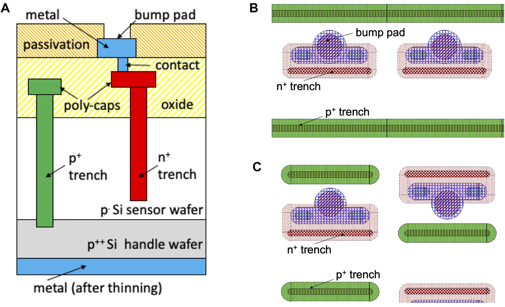 This observation motivated us to investigate a modified pixel design featuring dashed p+ trenches. In the proposed layout (Figure 1C), the placements of the n+ and p+ trenches, that are both 40 μm wide, are swapped. Considering the same pixel size of 55 × 55 μm2 of the existing device, this layout variant is still compatible with a regular (square) footprint of bump bonding pads in the readout chip, provided that the bump bonding pads in the pixels of even rows are vertically flipped, so that their center is vertically aligned to those of adjacent pixels in odd rows. Of course a half-pitch vertical offset between even and odd rows should be taken into account for particle hit point reconstruction, and the design of the edge termination at the sensor periphery should also be modified.