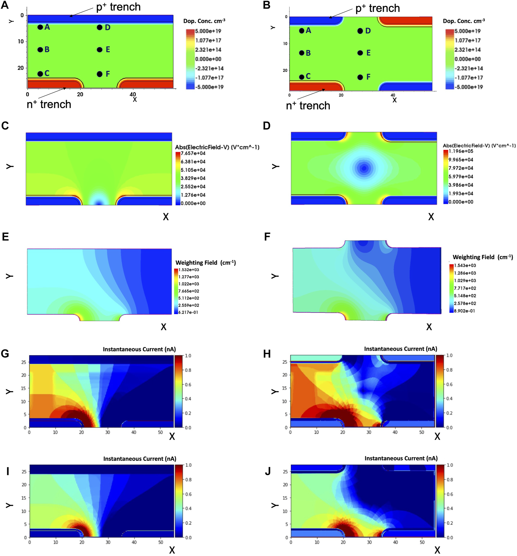 Simulation domains for (A) existing device and (B) proposed device, also showing the particle hit points (all dimensions in micrometers); distributions of the electric field at 100 V bias voltage for (C) existing device and (D) proposed device; distributions of the weighting field for (E) existing device and (F) proposed device. Ramo maps for electrons and holes at 100 V bias voltage: (G) existing device, electrons; (H) proposed device, electrons; (I) existing device, holes; (J) proposed device, holes.