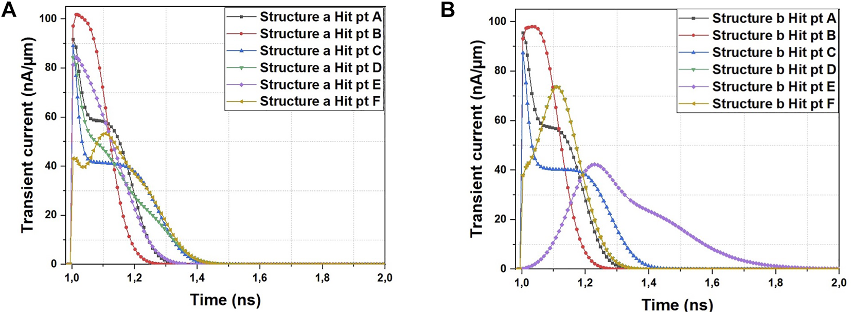 Simulated current signals as a function of time at 100 V bias voltage for different MIP hit points: (A) existing device, and (B) proposed device.