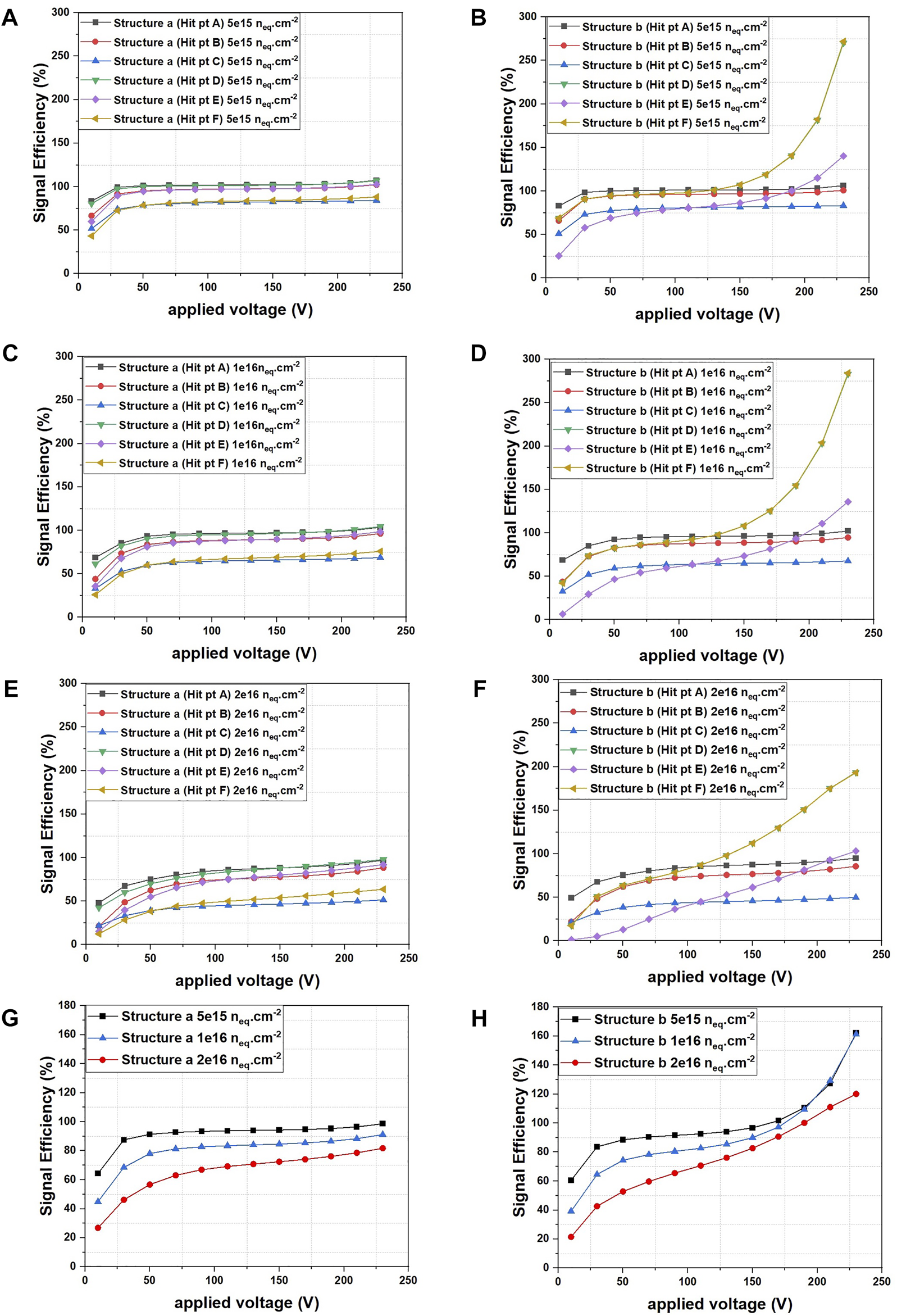 Simulated signal efficiency vs. applied voltage at different irradiation fluences: existing device for different hit points at (A) 5 × 1015neqcm−2, (C) 1 × 1016neqcm−2, and (E) 2 × 1016neqcm−2; proposed device for different hit points at (B) 5 × 1015neqcm−2, (D) 1 × 1016neqcm−2, and (F) 2 × 1016neqcm−2; average values at different fluences for (G) existing device and (H) proposed device.