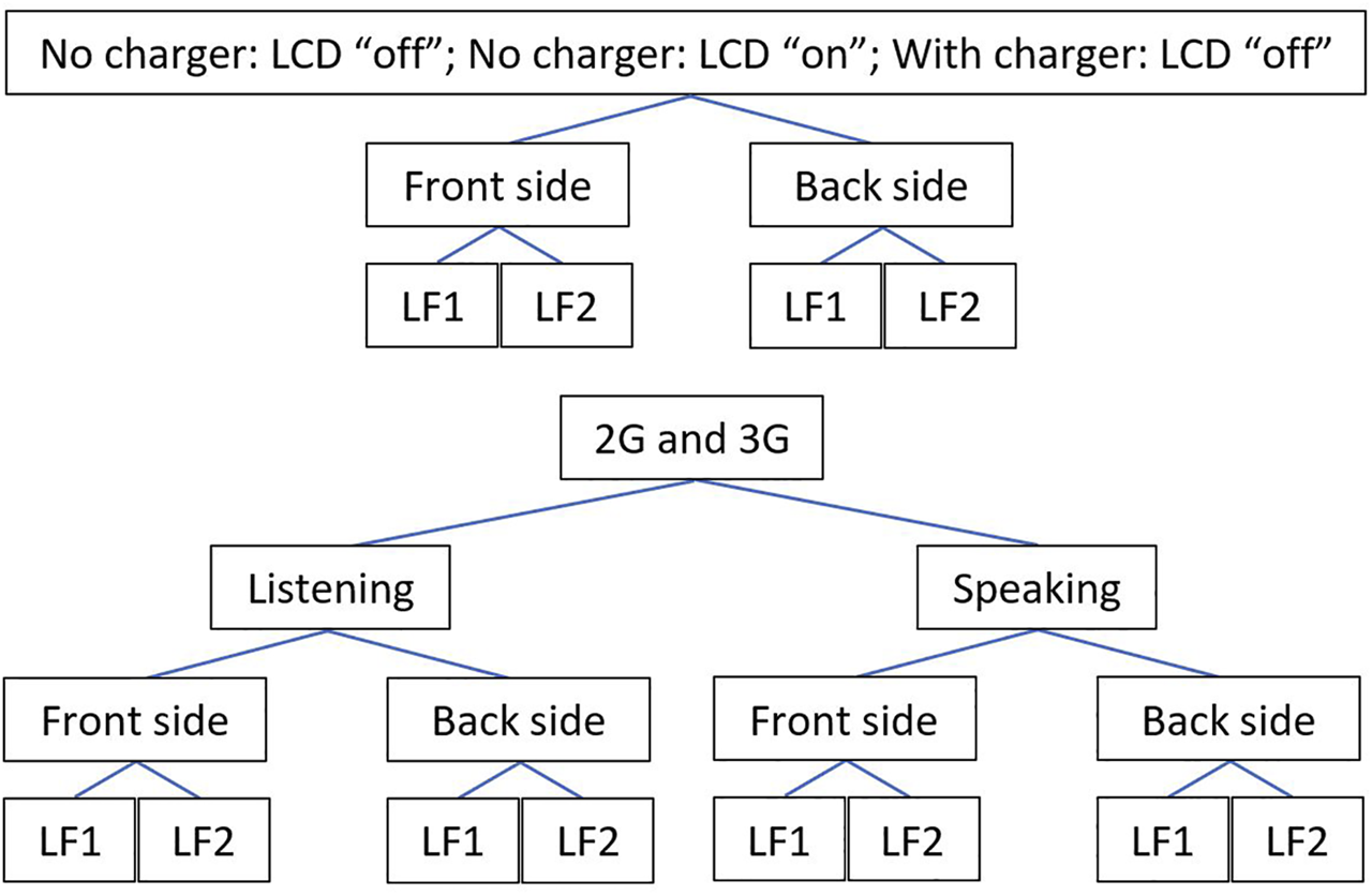 Each cell phone was examined within two distinct frequency bands: LF1 5 Hz–200 Hz and LF2 100 Hz—10 kHz. Measurements were carried out between 8 am and 12 am at three modes: standby, 2G and 3G. The standby mode was divided into three routines: 1) with charger applied and LCD “off”, 2) no charger and LCD “off”, 3) no charger and LCD “on”. In both frequency bands, the highest MF peaks were recorded at each mode by the Narda meters (Supplementary Figure S2). Although there were no significant differences between the 2G/3G standby modes, we provided data only for the 3G standby mode. Each 2G/3G mode was divided into two routines: 1) listening mode (downlink), LCD off, no charger, and 2) speaking mode (uplink), LCD off, no charger. For each routine, cell phones were inspected from the front and back sides. Thus, the total number of measurements was 140 for each phone.
