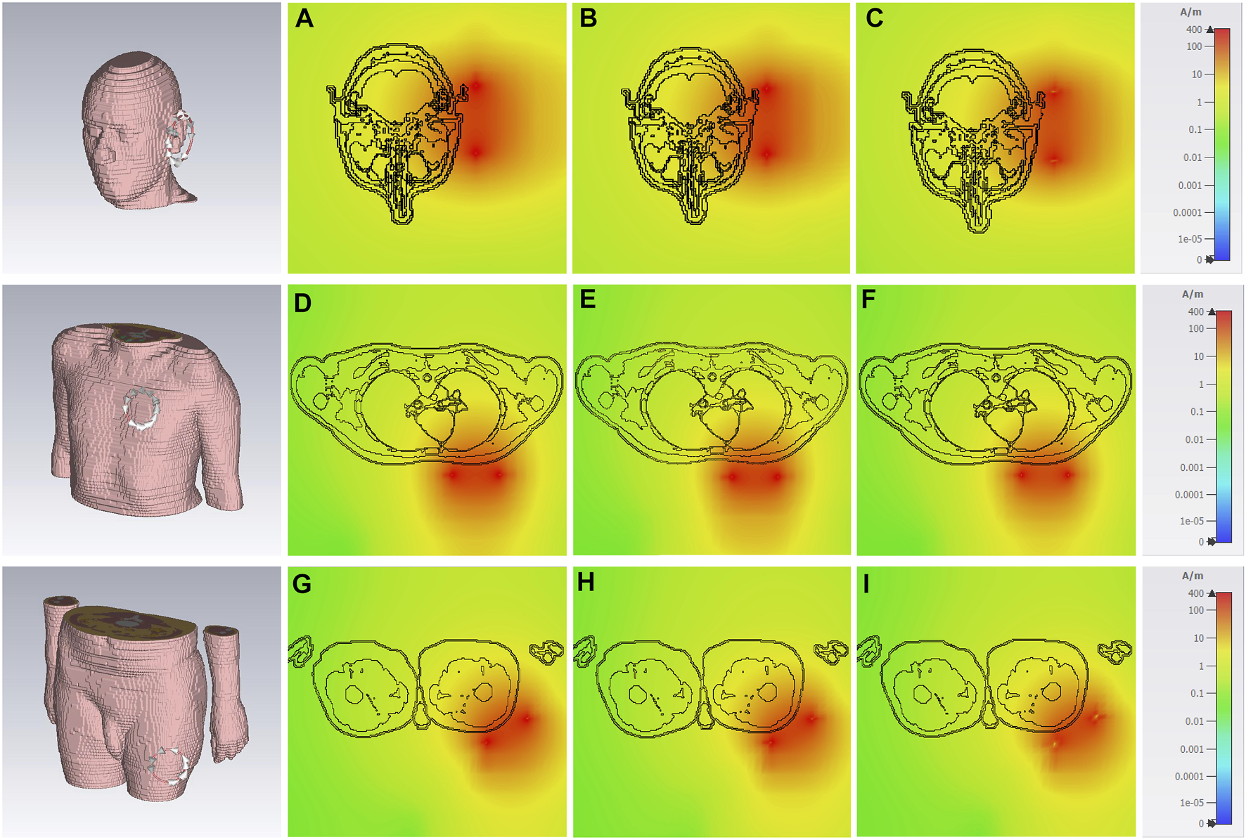The figure shows the magnetic field distribution in the human body simulated in CST studio. The highest measured value (70.03 µT) was set as “worst-case scenario” for each simulated area. The first row (A–C) displays field distribution in the head, the second row (D–F) display field distribution in the thorax, and third row (G–I) display field distribution in the pelvis area. The first column shows the coil placement, and the second, third and fourth columns show results for the 10 Hz, 50 Hz, and 200 Hz, respectively.