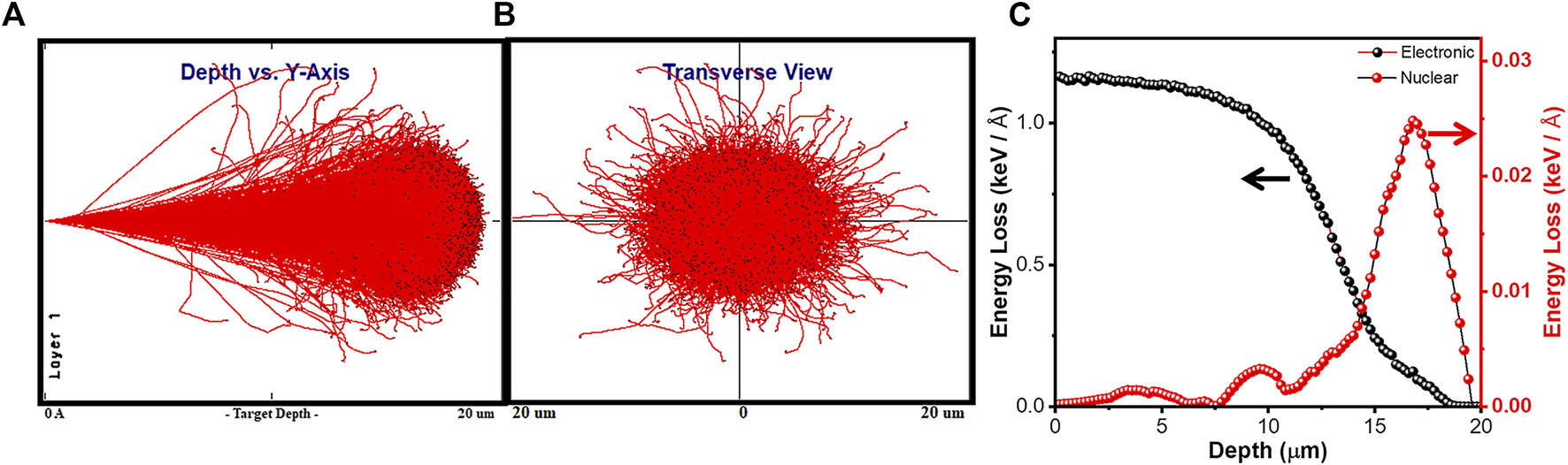 The longitudinal (A) and cross sectional (B) profile of KBTW ceramic pellet when irradiated by Ni+11 ions. (C) The nuclear and electron energy loss profile as a function of penetration depth from sample surface.