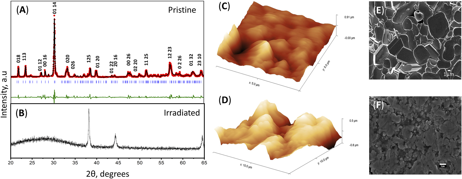 (A) The x-ray diffractogram of polycrystalline K2Bi4Ti4WO18. The bottom pattern (B) shows the amorphization post irradiation. The AFM images also depict an expected increase in the surface roughness after irradiation (D), when compared before irradiation (C) (E) The electron micrograph shows a grain distribution typical of bismuth layered structure. (F) The irradiation leads to surface amorphization with no clear crystallites.