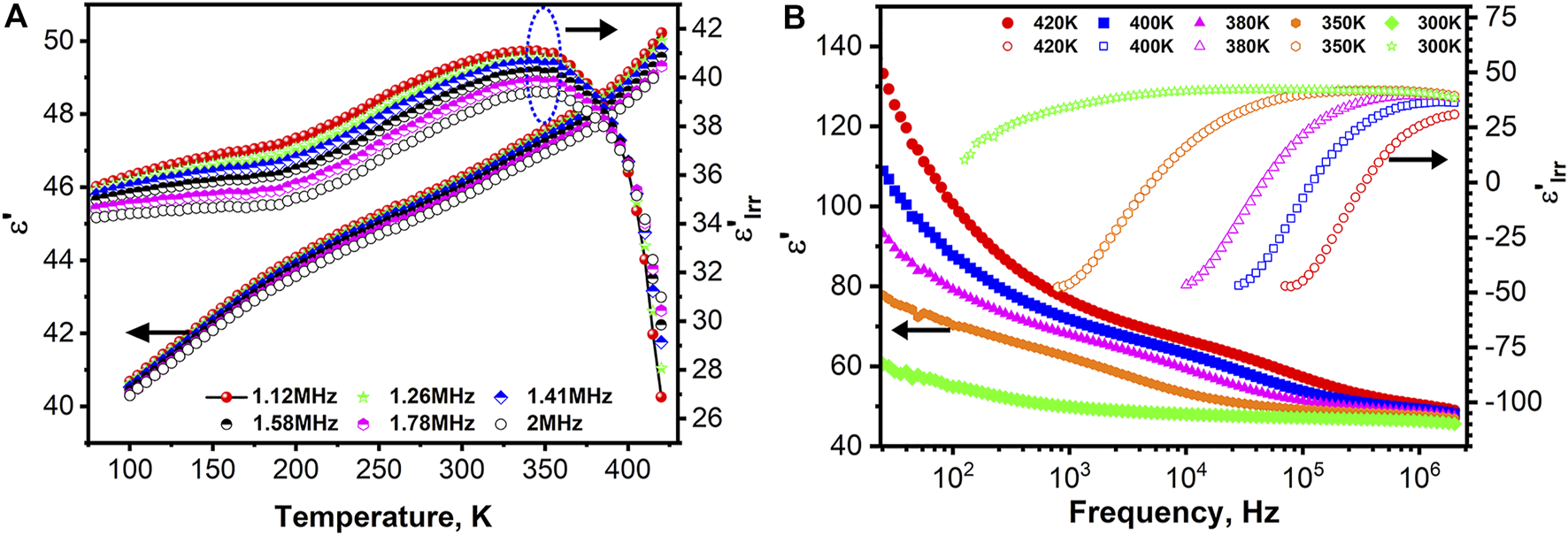 (A)The temperature dependent dielectric response for pristine (left y-axis) and irradiated (right y-axis) K2Bi4Ti4WO18. (B) The frequency dispersion of real part of dielectric constant at various temperature, shows a transformation to negative values above 350 K.
