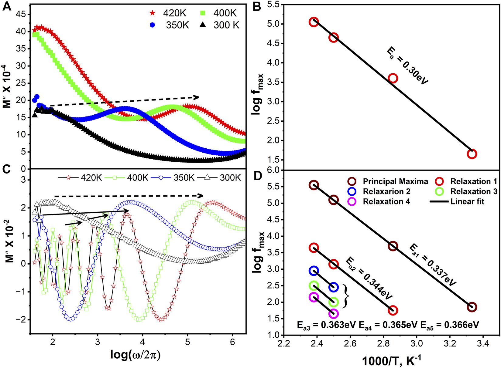 The frequency dispersion of imaginary part of modulus at discrete temperatures for pristine (A) (shown by solid symbols) and irradiated (C) (shown by hollow symbols) K2Bi4Ti4WO18. The activation energy profile for pristine (B) and irradiated (D) KBTW shows activation energies corresponding to different relaxations.