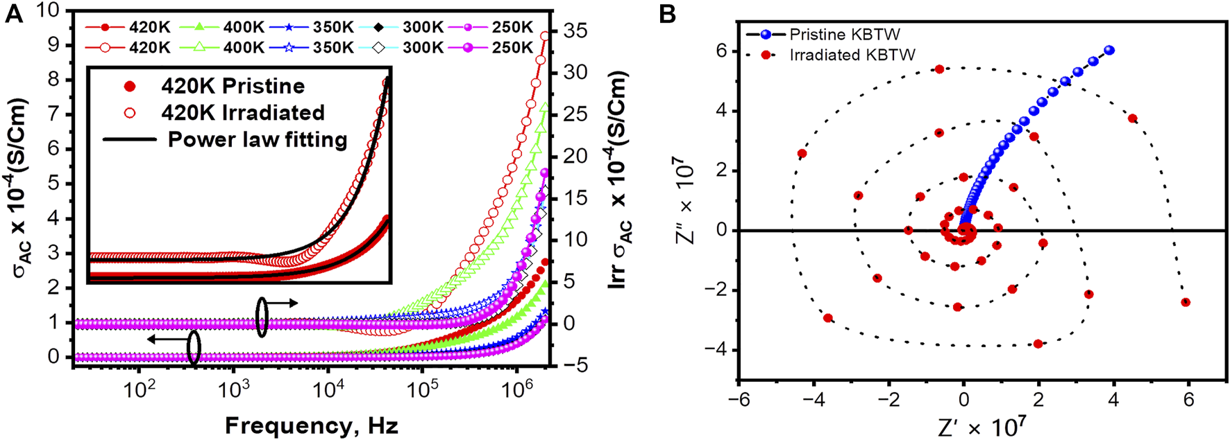 (A) The frequency dependence of conductivity for pristine and irradiated KBTW. The inset shows the deviation from Johncher’s law post irradiation. (B) The Comparative Nyquist plot in case of pristine and irradiated KBTW. The irradiated sample shows a spiral curve suggesting strong inductive effects at lower frequency.