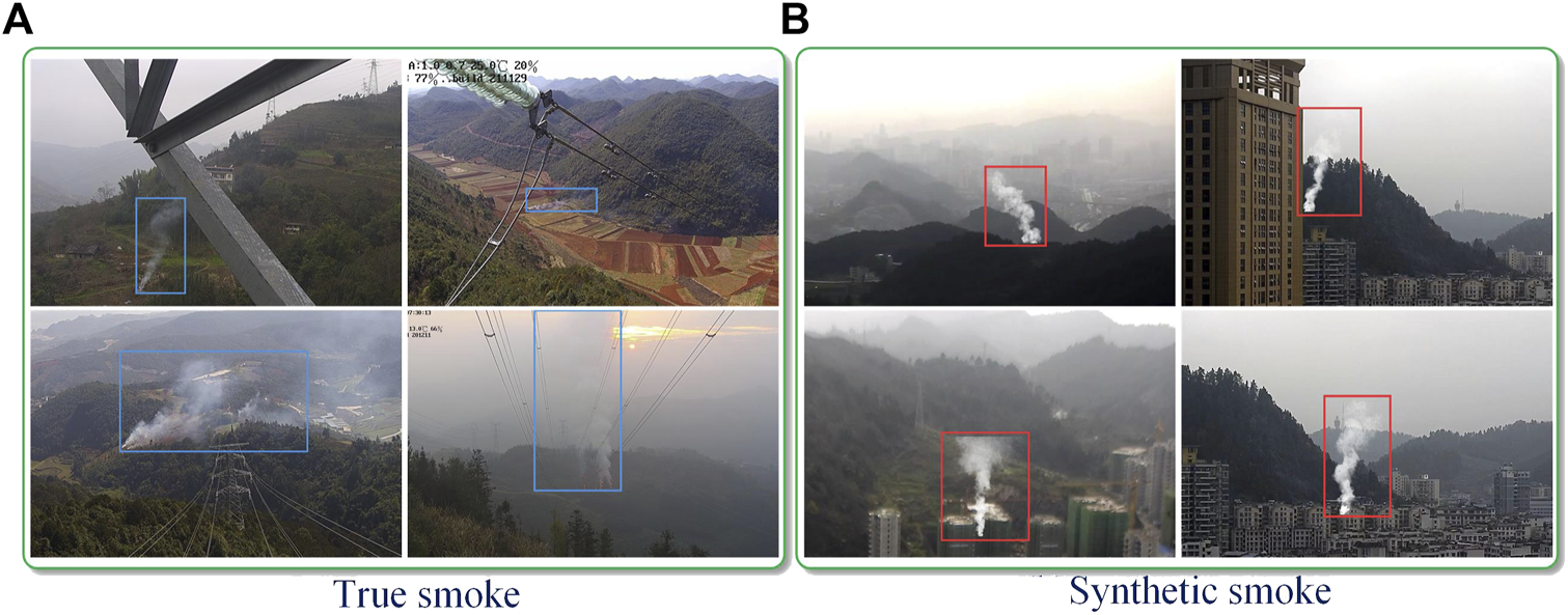 The real scene dataset True_smoke (TS) used in this experiment contains a total of 4,128 images. Among them, 1,275 images were taken from real transmission lines, 2,853 images were taken from google search engine and State Key Laboratory of Fire Science of University of Science and Technology of China. The training set and test set were divided according to a ratio of 7:3, and LabelImg was used for annotation, and the annotation format was the same as that of the popular dataset PAS-CAL VOC [38], the annotation information was stored in the. xml file. In addition, the synthetic datasets RFdataset (RF) [10] and SFdataset (SF) [10] are also used for experiments. RFdataset (RF) is synthesized from real smoke and forest background and contains 12,620 images, where, 3,155 images are used for training and 6,310 images are used for testing. The SFdataset (SF) is synthesized from simulated smoke and forest background and contains 12,620 images, where, 3,155 images are used for training and 6,310 images are used for testing.