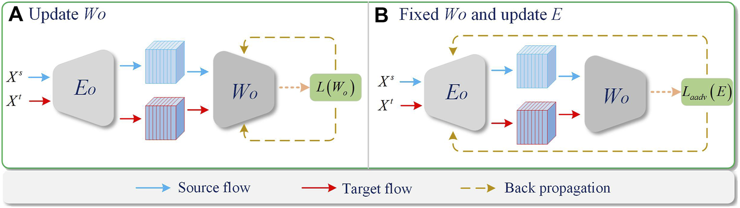 In order to mitigate the impact of inter-domain differences, this paper proposes a Multilevel Feature Aooperative domain Alignment module. The gap between the source and target domains is narrowed by adversarial learning between E and W0, W1, W2. In theory, if the extracted features from source and target domain do not have differences, W0, W1, W2 should not be able to distinguish the source domain and the target domain. By minimizing the following loss function to realize,At this time, the parameters of E (where E include E0, E1, E2) are updated by fixing the parameters of W0, W1, W2, and the source domain and target domain features are cross-constrained by domain labels. In this way, the extracted features are trained to adapt to the source domain and target domain, and the effect of domain alignment is achieved. The training process is shown in Figure 3. It is worth noting that, this paper not only uses the above way to mitigate the domain differences in the final features of Backbone, but also constrains the intermediate features of Backbone at the same time, and finally alleviates the impact of domain differences through the cooperative alignment of multi-level features.