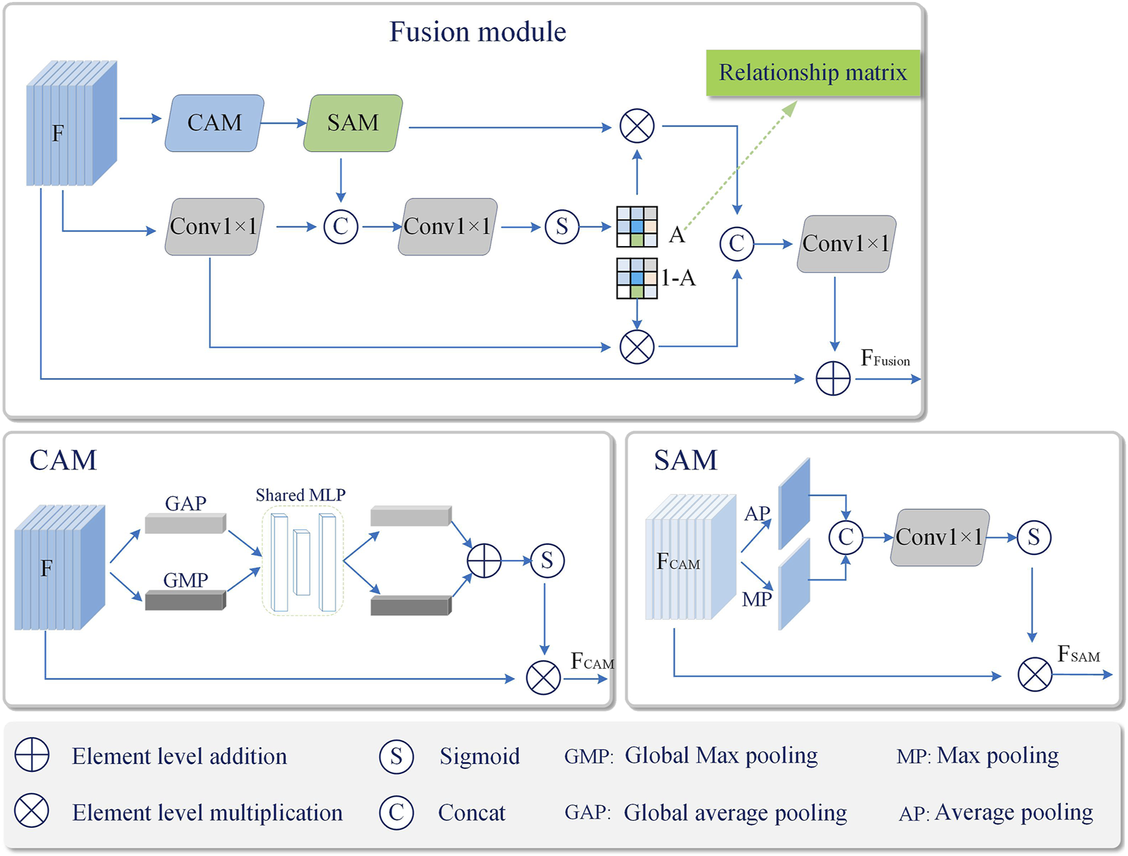 Specifically, for the feature map F output by C3_1 module in Neck, it is divided into two branches. Follow CBAM [37], the first branch is enhanced by Channel Attention Module (CAM) and Spatial attention module (SAM), and the second branch is enhanced by 1×1 convolutional layer (Conv1×1) to adjust the feature dimensions and increase the non-linear mapping ability of the network. The deep features are further extracted, and then the correlation matrix A is calculated for the features of the two branches,where, Sigmoid (⋅) represents the sigmoid activation function, F represents the output of C3_1 module in Neck, [a; b] denotes concatenation of a and b, Conv denotes 1×1 convolution, SAM and CAM denote spatial attention module and channel attention module, respectively. The relation matrix A reflects the relationship between the corresponding positions of the feature maps obtained by the two branches, and the larger the value is, the more important it is. Finally, the feature maps of the two branches are fused by the following operations, and the fused features FFusion are used as the input of the later network layer.where, FSAM = SAM(CAM(F)) denotes the output of the spatial attention module, ⊗ denotes element-wise multiplication, and ⊕ denotes element-wise addition. It can be seen that the proposed fusion module adaptively adjusts the contribution of the two branches at the corresponding positions of A and 1-A, so as to achieve a better fusion effect, and finally improve the robustness of smoke features and enhance the representation ability of small target smoke.