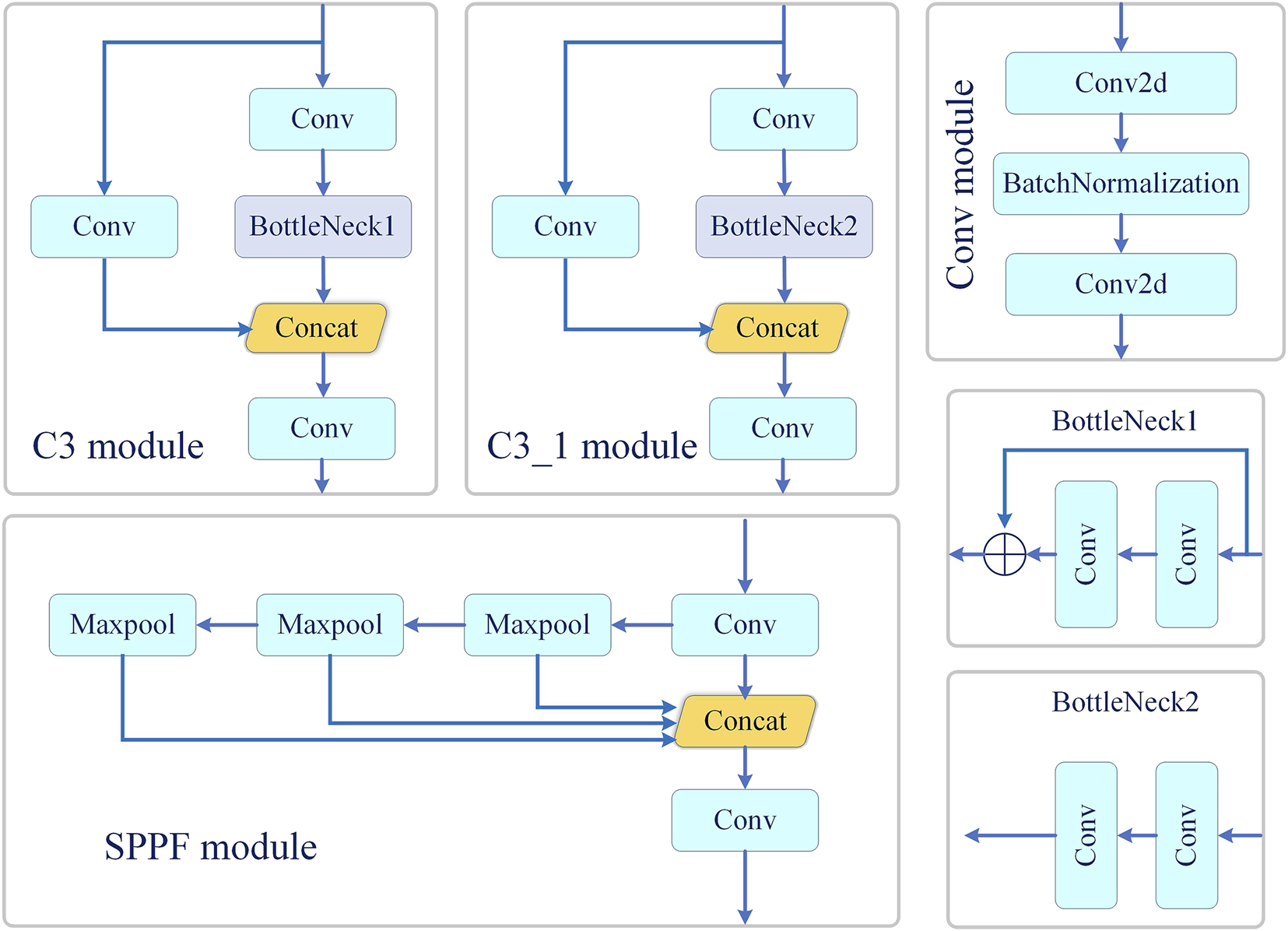 The details of the C3 module, SPPF module and other module in Figure 2.
