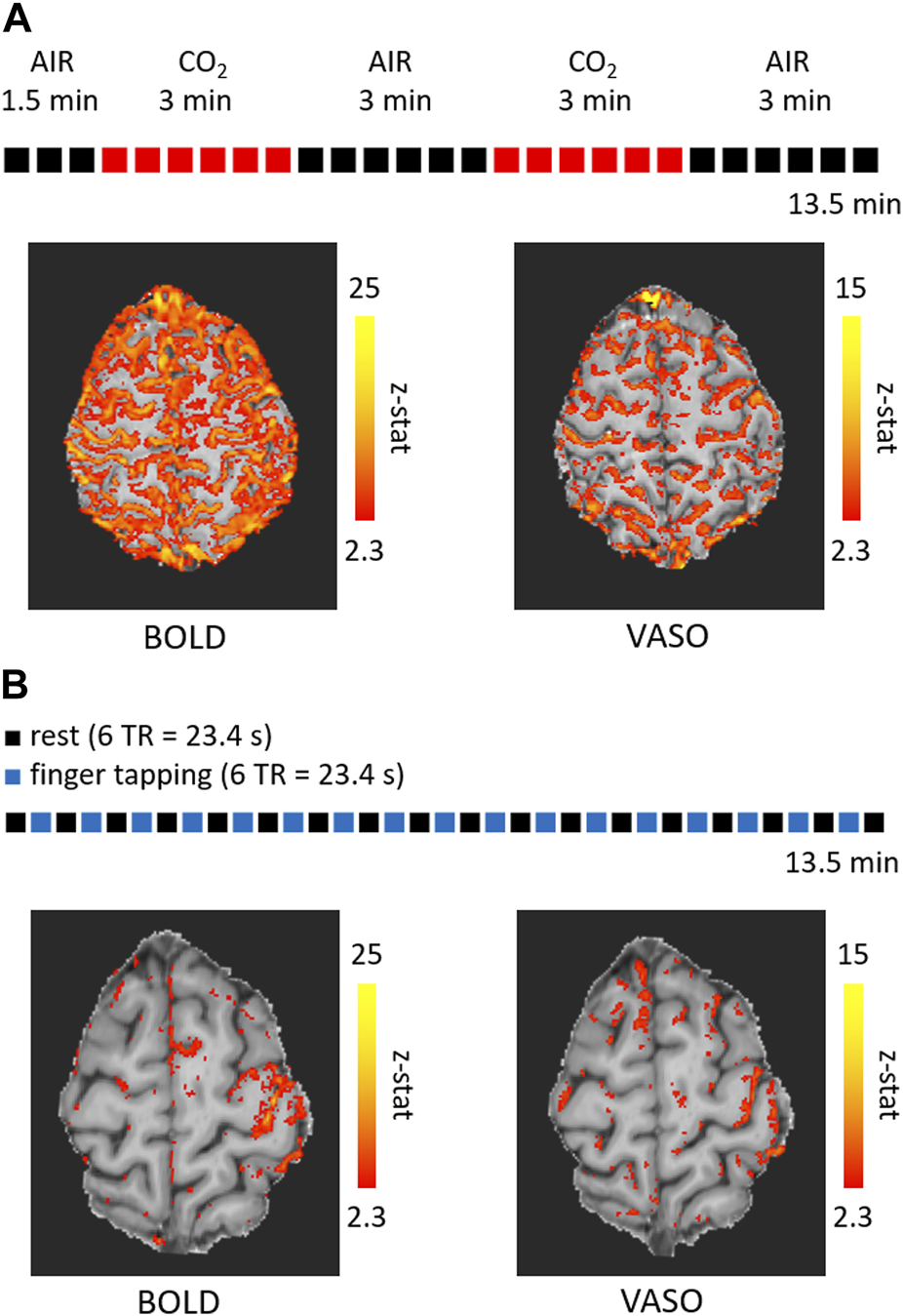 Activation maps overlaid on the mean of the VASO timecourse obtained with the acquisition of 210 pairs of volumes (210 BOLD volumes and 210 VASO volumes) at a isotropic resolution of 0.9 mm for a breathing paradigm involving hypercapnia (A) and a right-hand finger tapping task (B). The duration was 13.5 min (TR = 3.9 s) for each run.