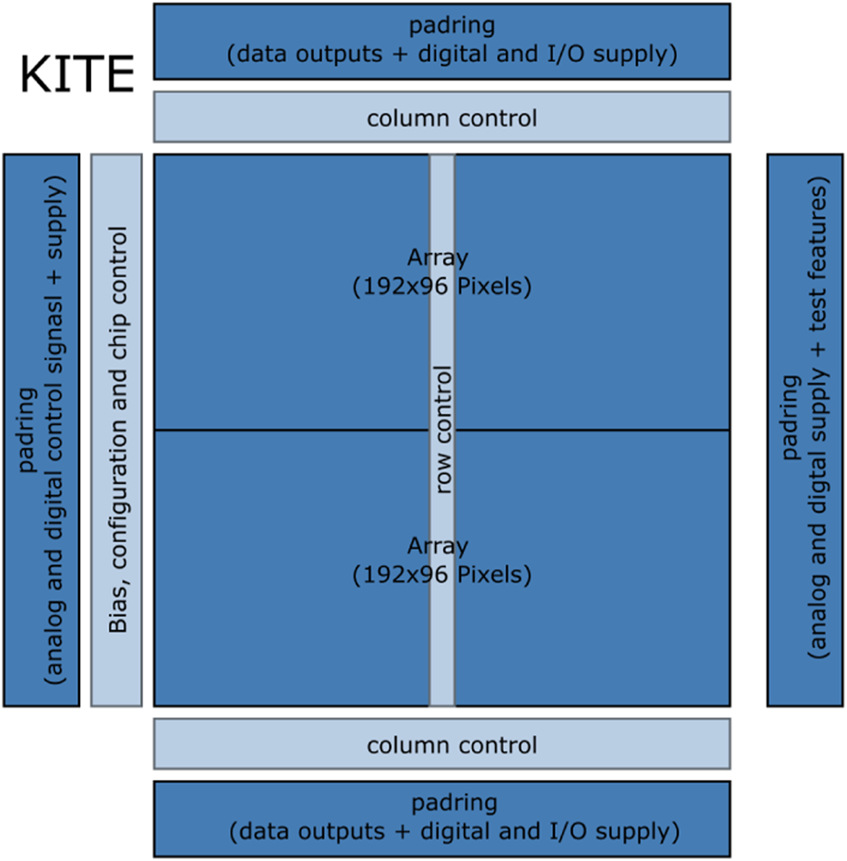 In a recent work [19], we introduced a novel electron counting application-specific integrated circuit (ASIC) named KITE, which, in combination with a suitable hybrid pixel semiconductor sensor, aimed at offering a balanced solution to the abovementioned requirements. The chip key features are a pixel size of 100 μm × 100 µm arranged in a matrix of 192 × 192 elements; a pixel front-end electronics that is compatible with both the hole and electron collection modes required by standard silicon and high-Z sensors (acting as direct detection layers). The detector exhibits no dark counts, due to a counting threshold well above the noise level, and no spurious counts associated to the readout operation, since data are digitized in the pixel, allowing the detection of single electron events, while maintaining extremely high count rate capability up to 108 counts per second per pixel (cts/s/pix), owing to the instant retrigger technology [20]. The detector design allows for continuous frame rates as high as 120 kfps, extendable to ∼500 kfps with an improved readout hardware, with massive readout parallelization and two on-chip data compression mechanisms, namely, floating-point counter encoding and 2 × 2 pixel digital binning.
