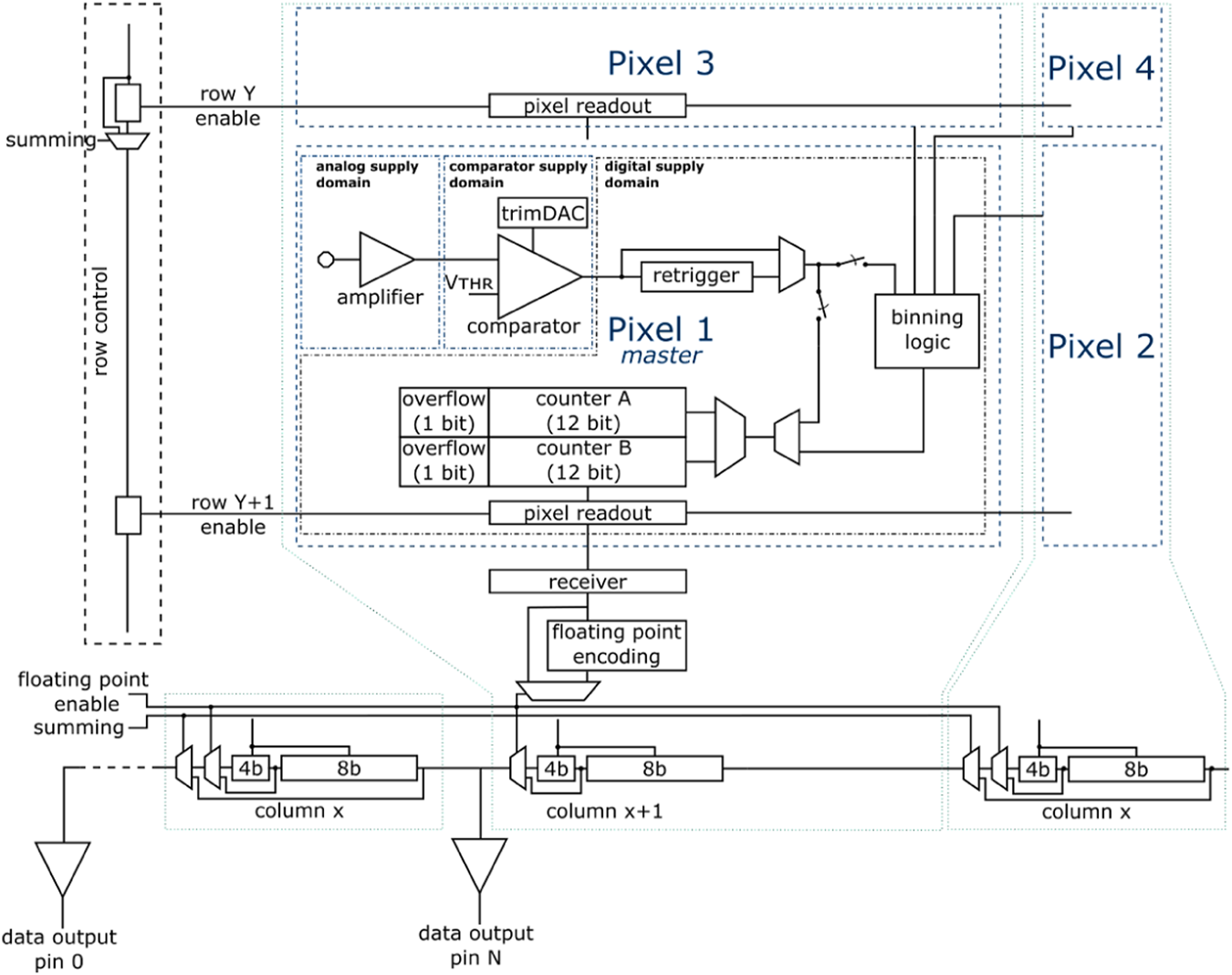A high frame rate capability was obtained in two ways. First, top and bottom chip peripheries feature 64 single-ended, serial data out (SDO) lines each for massive parallel readout, which occurs from the middle of the chip to the periphery. Second, the two types of on-chip data compression mechanisms were implemented, namely, the floating-point counter encoding and the 2 × 2 pixel digital binning. The floating-point counter encoding converts the 12-bit counter value from an integer to an 8-bit floating-point representation on-the-fly and with negligible overhead, using 5 bits for the mantissa and 3 bits for the exponent and implementing the implicit leading bit technique, yielding a compression factor of 3/2. The maximum representable numbers for the integer and floating-point representation are similar, 4,095 and 4,032, respectively. The discretization relative error introduced by the floating-point representation is below ∼3% over all the counting range and, in any case, not higher than the one obtained by the Poisson statistics of the incoming beam. The 2 × 2 pixel digital binning mechanism merges the counts of four neighboring pixels at the counter level (hence digitally), yielding a compression factor of 4. The two mechanisms are enabled independently, thus yielding an overall compression factor of 6. Figure 2 shows a simplified schematic diagram of the signal readout from the front-end electronics of a representative pixel to the corresponding serial data output pin. Currently limited by the 10-Gb/s bandwidth of the readout hardware, the frame rate ranges from 20 kfps in the normal mode up to 120 kfps with both compression mechanisms enabled. Without this limitation, VHDL simulations show that it would be, in principle, possible to reach frame rates ranging from 120 kfps in the normal mode up to ∼500 kfps with both compression mechanisms enabled, with a generated data rate in the order of 45 Gb/s. In terms of power consumption, static dissipation is 1.25 W while the dynamic dissipation is at most ∼4 W.