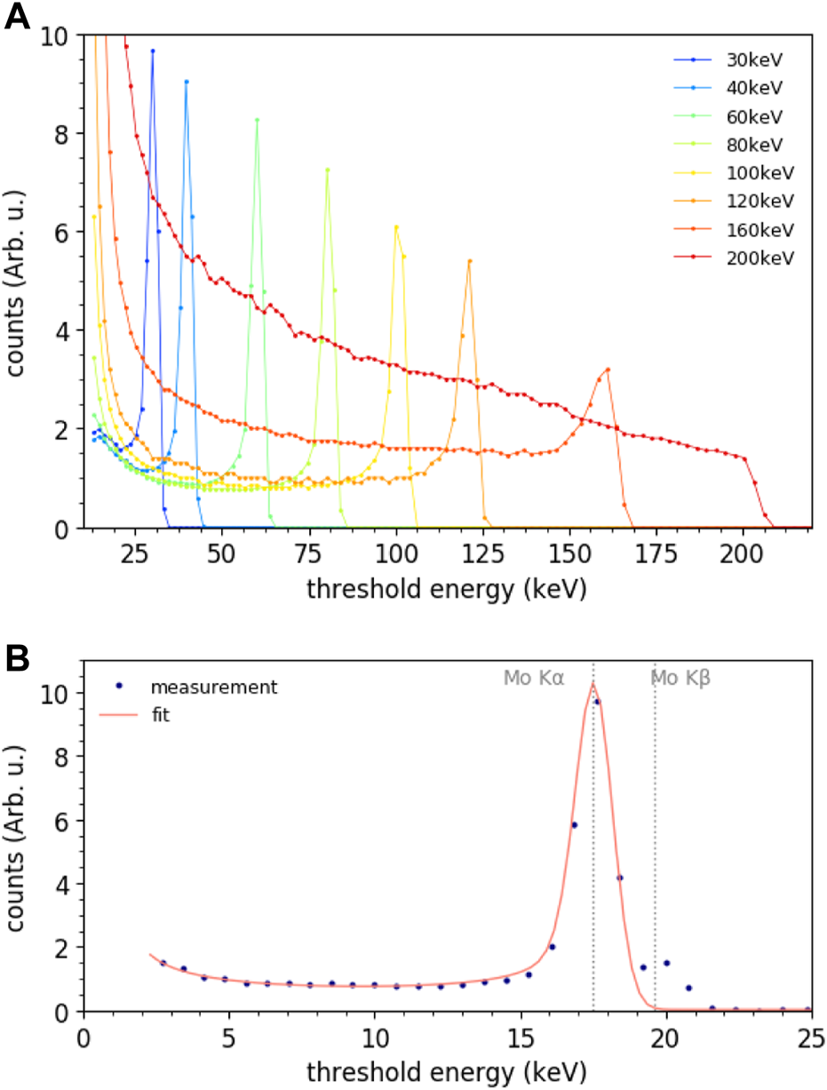 Differential energy spectra measured for the several incoming electron energies as a function of the threshold energy (A). Fitting of the Mo fluorescence spectrum with the analytical pixel response model of [26] (B).