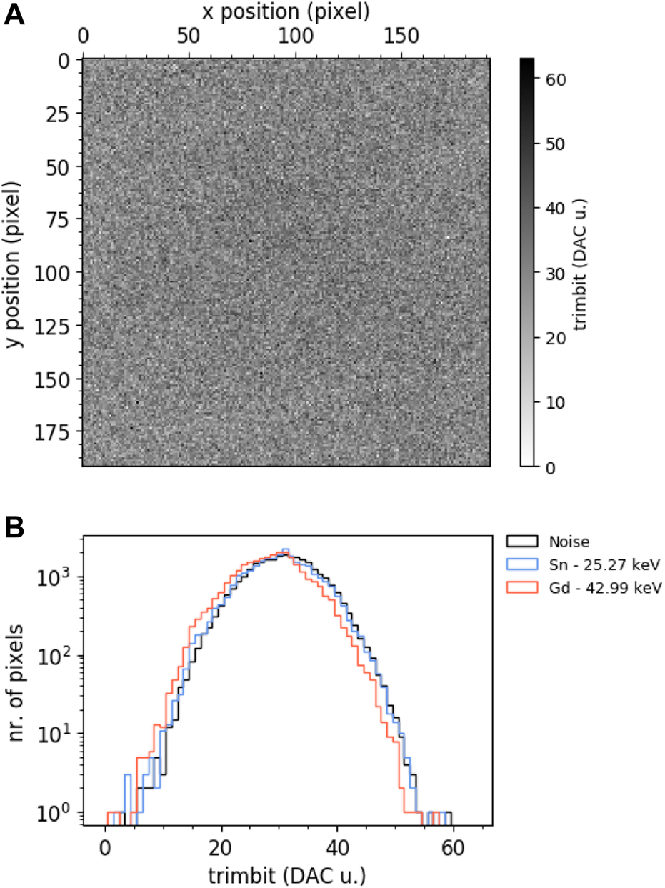 Trimbit map computed at the noise level (∼6 keV) (A) and corresponding trimbit distribution plus the ones obtained using Sn and Gd fluorescence spectra (B).