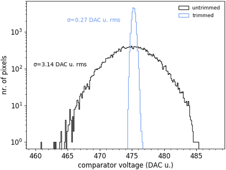 The effectiveness of threshold trimming was evaluated by retrieving the statistical distribution of Sn Kα fluorescence peaks over the pixels ensemble before and after the application of the trimbit map. The result is shown in Figure 8. The untrimmed distribution has a standard deviation of 3.14 DAC u. rms, corresponding to 5.51 keV rms; the trimmed distribution has a standard deviation of 0.27 DAC u. rms, corresponding to 0.48 keV rms, improving by a factor 11.48.