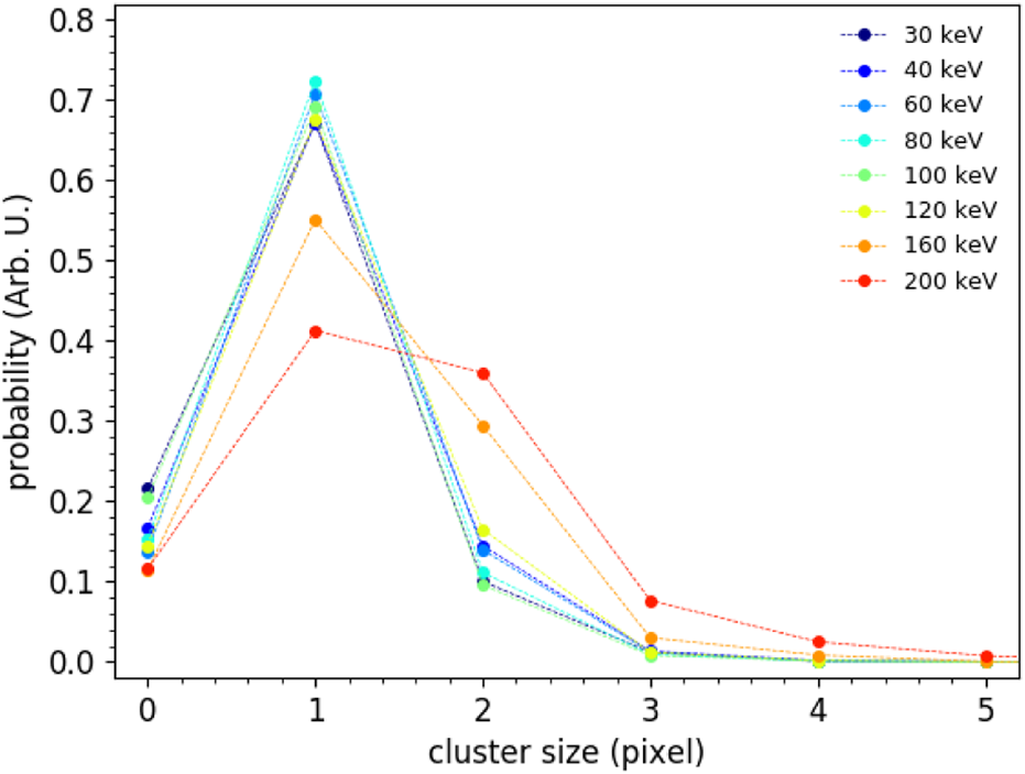 The random nature of electron energy deposition tracks found in the sensor causes individual events to be recorded possibly over multiple, neighboring pixels. The number of firing pixels per event, or single-event multiplicity, is, therefore, described by its probability distribution function, denoted as Pm, which is, in general, also a function of the threshold energy. To measure such distributions, we acquired a series of images in a condition of extremely low electron flux illumination such that not only individual clusters are clearly distinguishable but also the probability of cluster overlapping is minimal. Since it is not possible to directly measure the fraction of events leading to 0 counts, we computed it indirectly from the experimental knowledge of the average single-event multiplicity obtained with the Faraday cup available in the microscope. Figure 9 shows the single-event multiplicity distributions measured for each of the incoming electron energy, with thresholds according to Table 1. For energies up to 100 keV, the behavior is very similar and strongly peaked at the cluster size value of 1. For increasing energies, the distributions shifts toward higher values as a consequence of increased lateral straggling relatively to the dimension of the pixel. To understand the dependence of the lateral straggling on the incoming electron energy, we can refer to the simulation results shown in Figure 10C, where we report the radius containing a certain fraction of the total deposited energy as a function of the electron energy, averaged over 1 million electron tracks. For example, the 95% of the total average deposited energy is achieved at a distance from the impinging point going from 6 um for 30 keV electrons up to 137 um for 200 keV electrons, in a superlinear manner. Figure 10A shows the corresponding top-view distribution of the average energy deposition for the specific case of 100 keV electrons. For completeness, Figure 10B shows the corresponding radial distribution across the sensor depth.