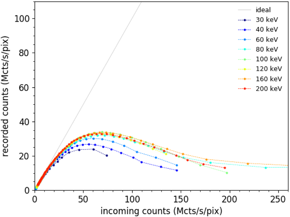 The count rate curves were measured by illuminating the detector with an electron beam of constant intensity on a progressively decreasing area—obtained by focusing the beam through the condenser lenses of the microscopes—in order to increase the flux density per pixel. The incoming count rates were obtained from the knowledge of the size of the illuminated area and assuming a linear relationship between incoming and recorded rates at low beam intensities. Figure 11 shows the count rate curves for the several incoming beam energies acquired in the paralyzable counting mode, i.e., with the retrigger mechanism disabled. The curves exhibit the typical non-monotonic paralyzable behavior, with maximum recorded count rates ranging approximately from 30 Mcts/s/pix at 30 keV to 35 Mcts/s/pix at energies greater or equal than 100 keV.