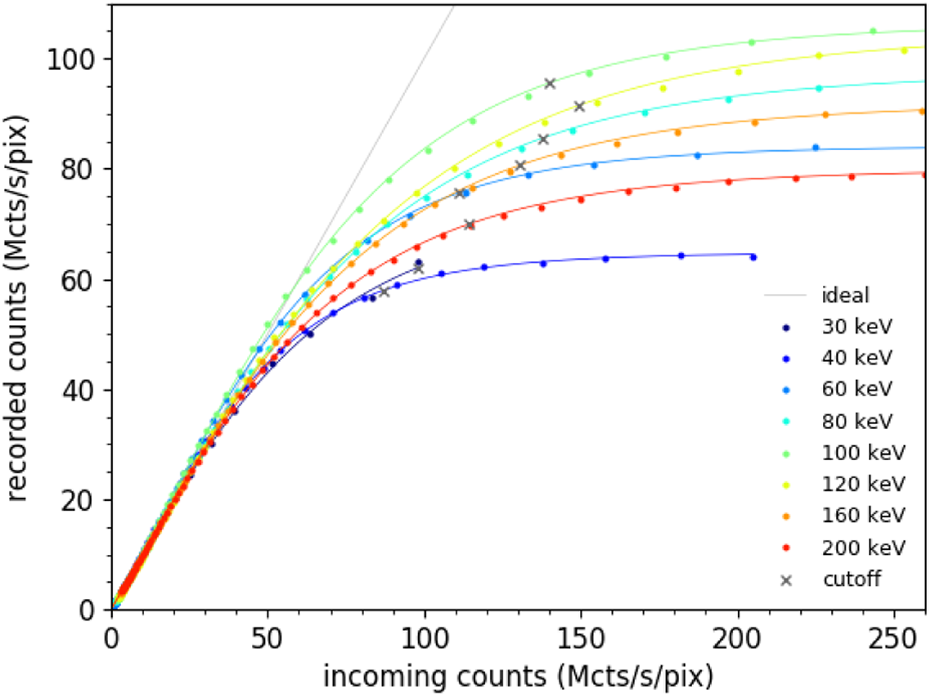 As a measure of the response linearity, it is typical to refer to the incoming rate yielding 10% recorded count rate loss. For the non-paralyzable counting mode, they range from 41.5 Mcts/s/pix at 30 keV to 84.3 Mcts/s/pix at 100 keV. Table 3 shows the full list of values for all the probed electron energies. Because of the availability of the Faraday cup in the microscope, it was possible to translate values of incoming count rates into incoming electron rates by measuring the absolute electron flux. The formerly reported values at 30 keV and 100 keV become 45.9 Mel/s/pix (7.3 pA/pix) and 98.0 Mel/s/pix (15.7 pA/pix), respectively.