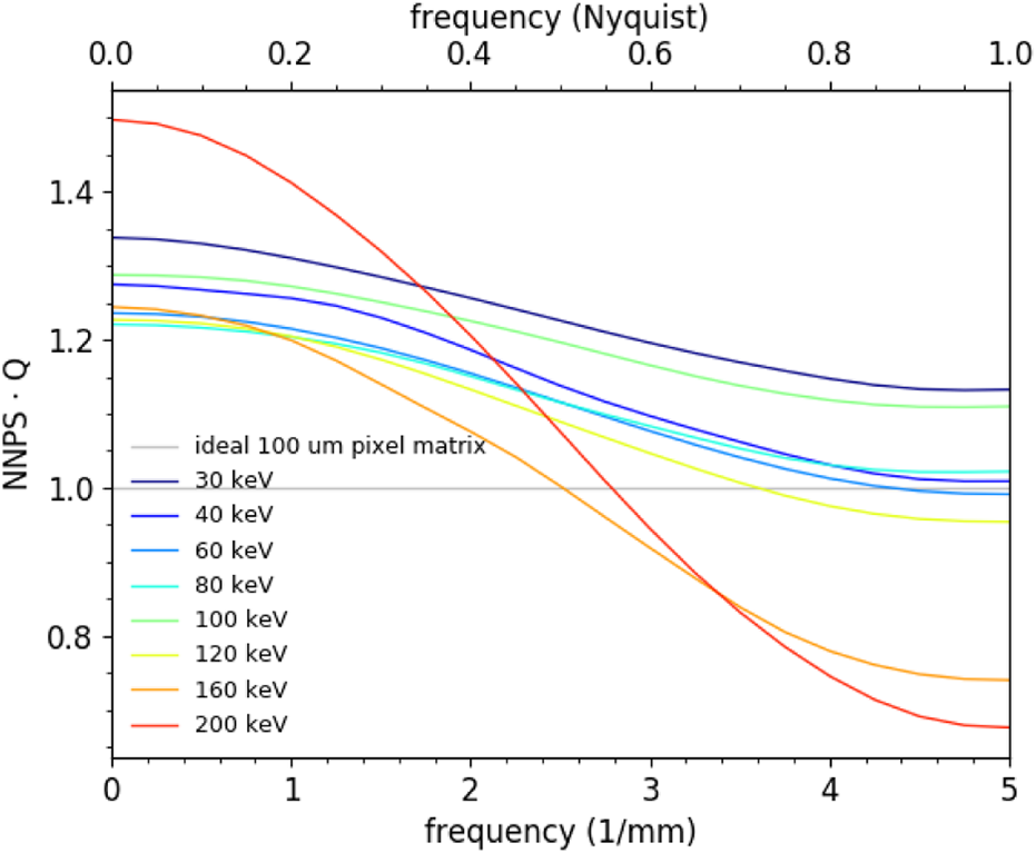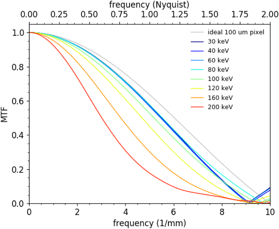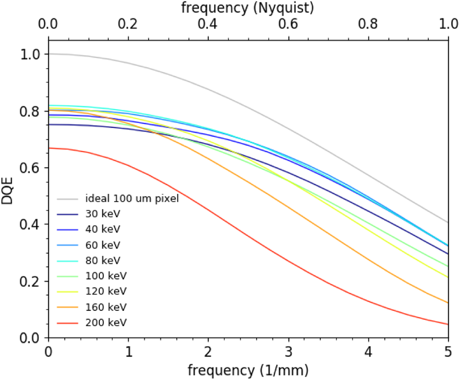 The choice of threshold energy plays a critical role in optimizing the detector performance in view of its use in the field, as it influences two of the most prominent figure of merits, namely, DQE and count rate capability, in opposite ways. On the one hand, lower threshold values typically imply higher DQE values. This happens because at lower thresholds, a higher fraction of events is detected and, therefore, the “information content” of the image, of which DQE is a measure, is higher. Given that the dependence of DQE on the threshold is non-trivial, we relied on numerical simulations and took DQE (0) as a representative of the overall DQE behavior. On the other hand, higher threshold values imply higher count rate capabilities, the reason being that at higher thresholds, the detector dead time, corresponding to the time-over-threshold of the analog signal in the pixel front-end electronics, decreases, and therefore, the system paralysis occurs at higher incoming event rates. In this case, the dependence of the count rate capability on threshold energy is on a first-order approximation proportional.