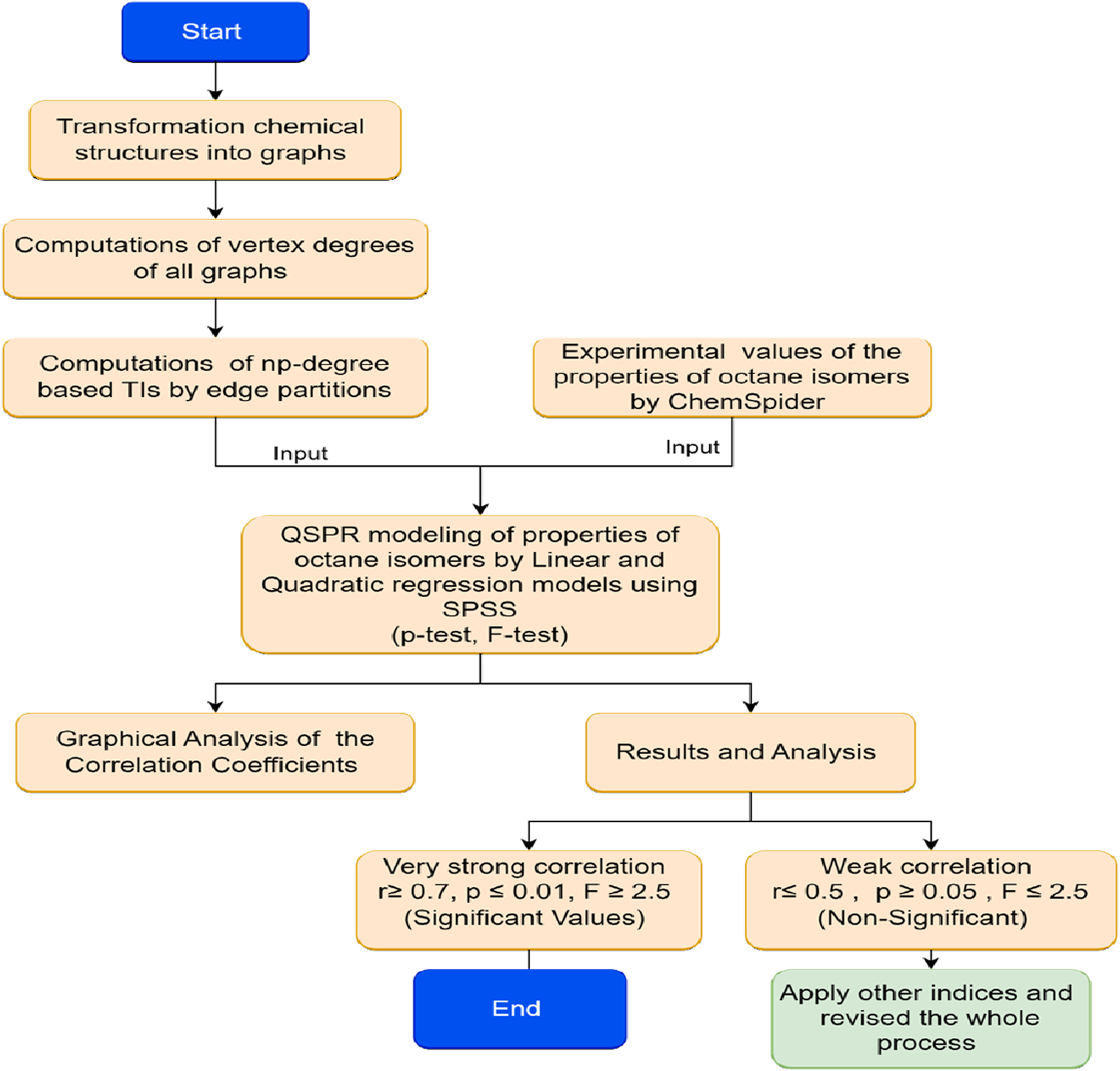 There are two types of computations done here: computation of numerical descriptors and statistical computations. The degree-counting technique is used to count the degrees and np-degrees. Vertex partitioning, np-degree edge partitioning, and computational techniques are used to calculate the estimated values (np-degree TIs). The calculations are done using a scientific calculator and verified by MATLAB software. The software SPSS uses for statistical computations such as regression equations and statistical parameters The 2D graphs of comparison and correlation are drawn by Microsoft Excel. The experimental data is taken from chemSpider. The procedure for estimating the properties of octane isomers by np-degree-based TIs is given below in Figure 2.