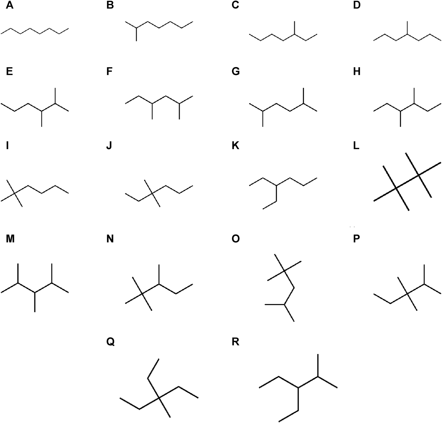 Chemical graphs of octane isomers. (A) Octane. (B) 2-Methylheptane. (C) 3-methylheptane. (D) 4-Methylheptane. (E) 2,3-Dimethylhexane. (F) 2,4-Dimethylhexane. (G) 2,5-Dimethylhexane. (H) 3,4-Dimethylhexane. (I) 2,2-dimethylhexane. (J) 3,3-Dimethylhexane. (K) 3-Ethylhexane. (L) 2,2,3,3-tetramethylbutane. (M) 2,3,4-trimethylpentane. (N) 2,2,3-Trimethylpentane. (O) 2,2,4-trimethylpentane. (P) 2,3,3-trimethylpentane. (Q) 3-Ethyl-3-methylpentane. (R) 2-methyl-3-ethylpentane.